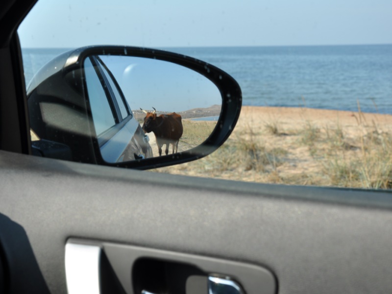 Чакракское озеро нашли со 2й попытки (это уже потом я увидел визикомовскую карту с достоверной дорожной разметкой, а вот iGO8 с апрельской картой в таких дебрях довольно странно путь прокладывал). Но оно того стоило: шикарный вид - коса, слева огромное соленое грязевое озеро, справа море. Встречаются нудисты и "грязевые негры"