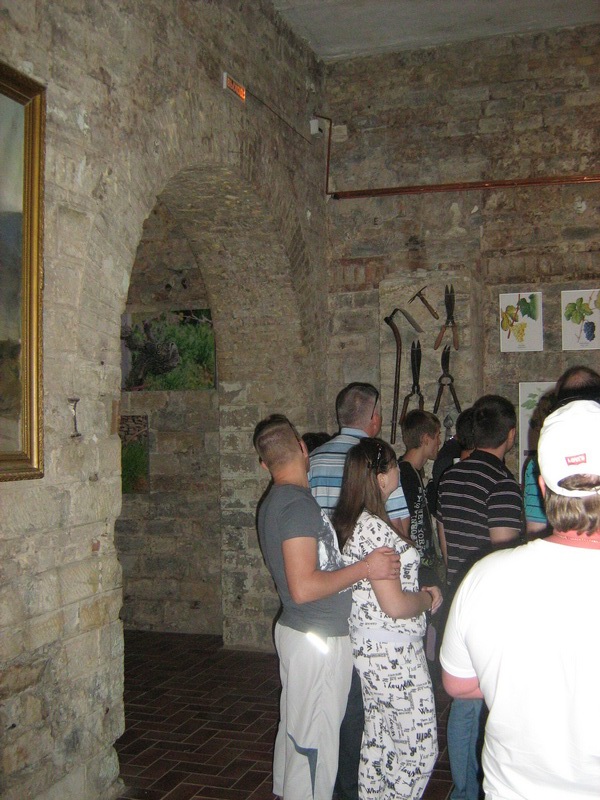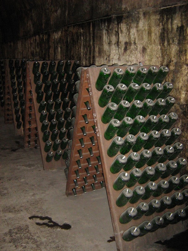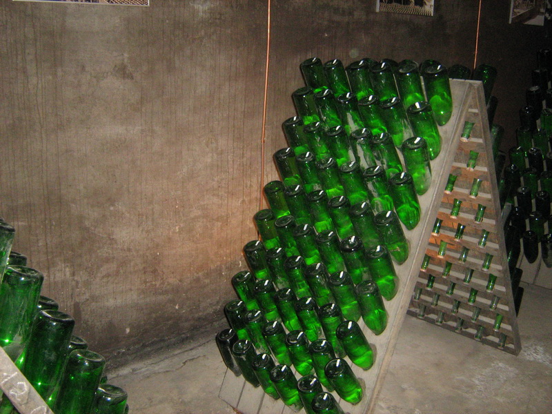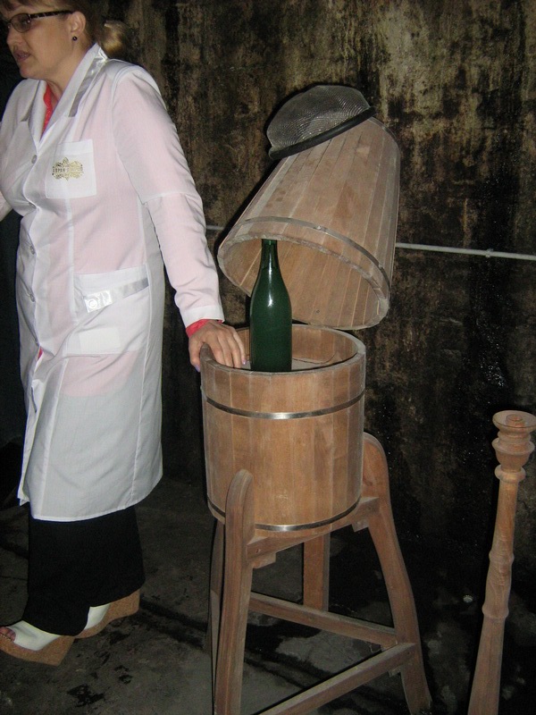 Бутылки, хранящиеся в туннелях сначала в полустоячем положении на раскладках поворачивают под разными углами, отмечая белой краской-маркером и подписывают стойку, после ряда таких процедур, растянутых на около 2 года, удаляют осадок, дополняют фруктовым ликером и закупоривают. Нам несколько раз порекомендовали не хранить шампанское годами, так как это живой продукт и он не становится с возрастом лучше, а может просто перекиснуть и превратиться в уксус.