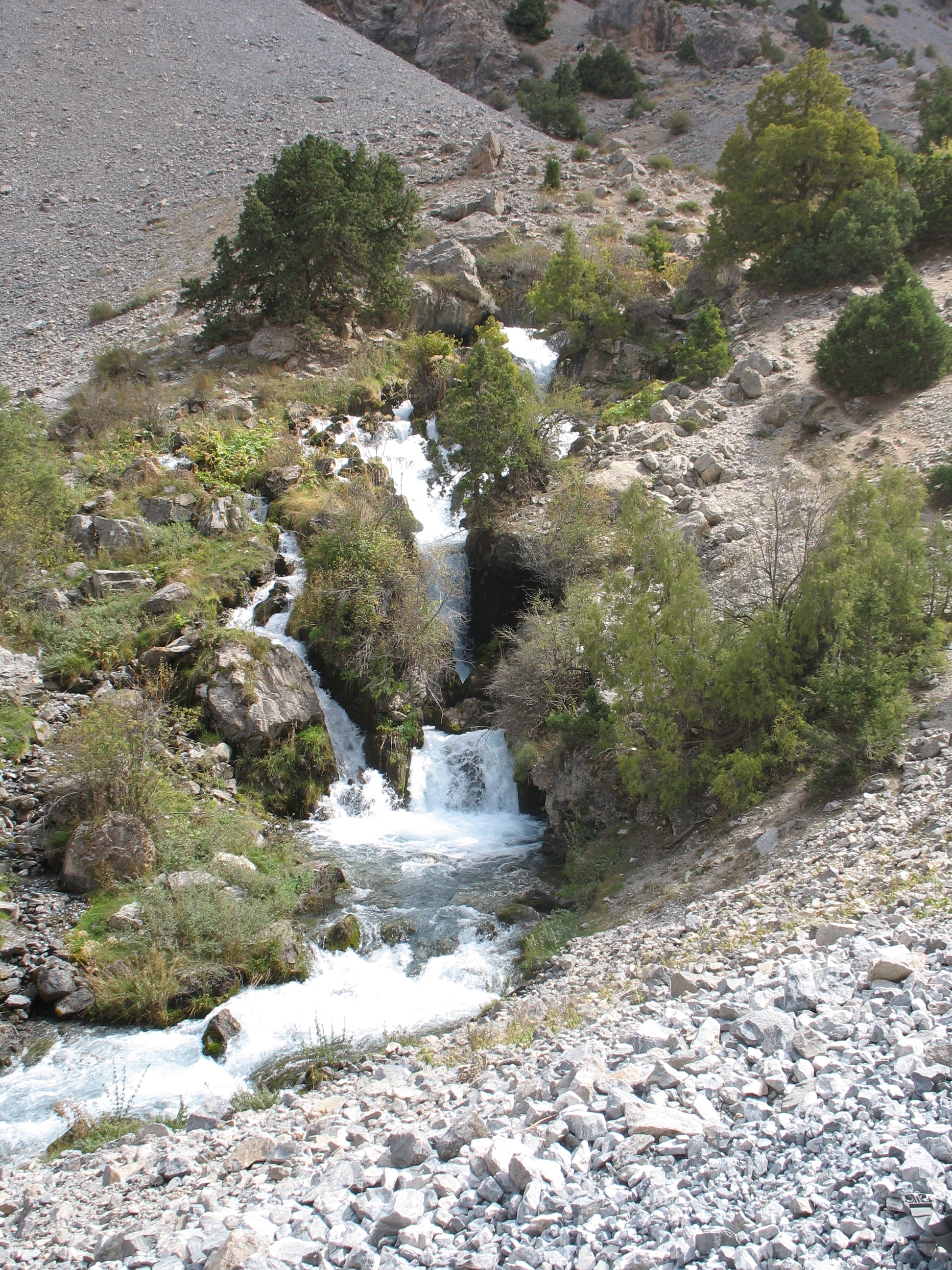 Спочатку нас супроводжувала чистенька гарна річка Уреч з безліччю порогів і водоспадів, але в верхній частині ущелини вона зникла під кам`яними завалами.