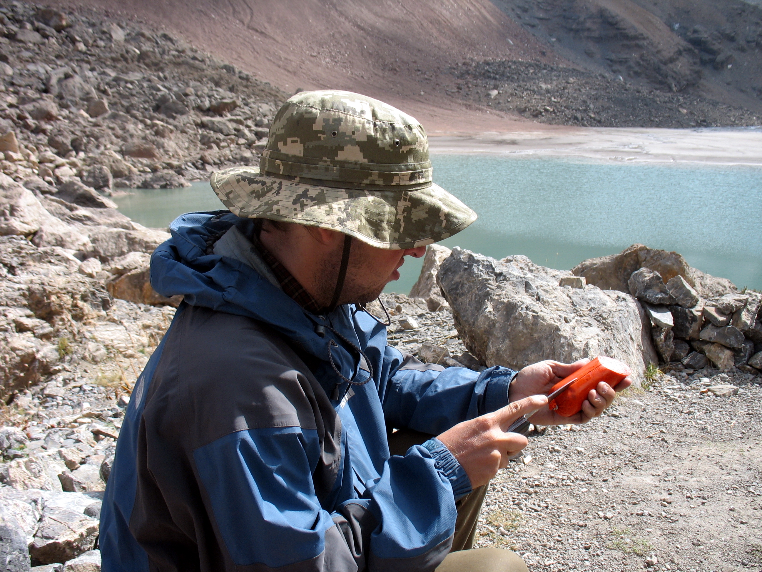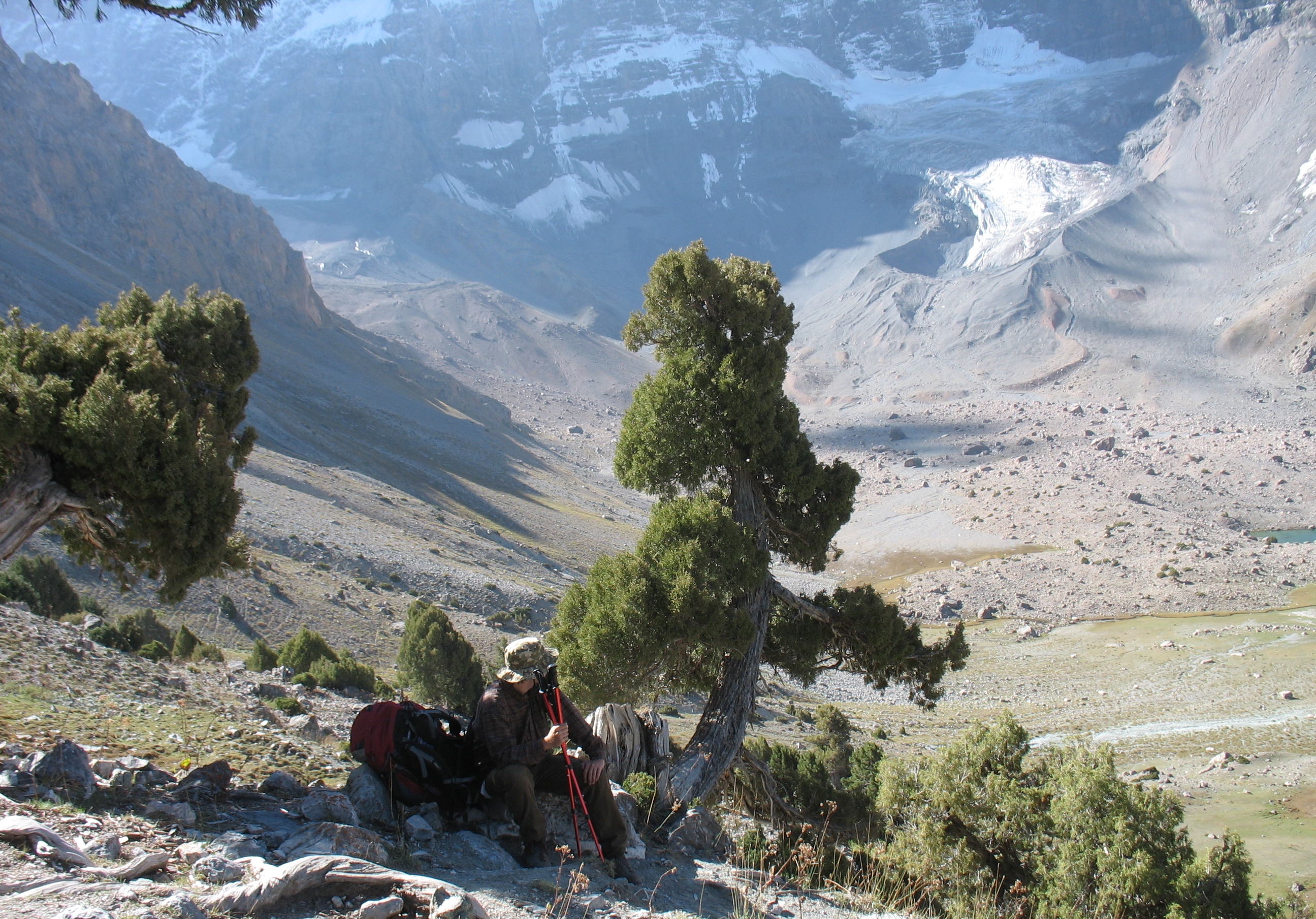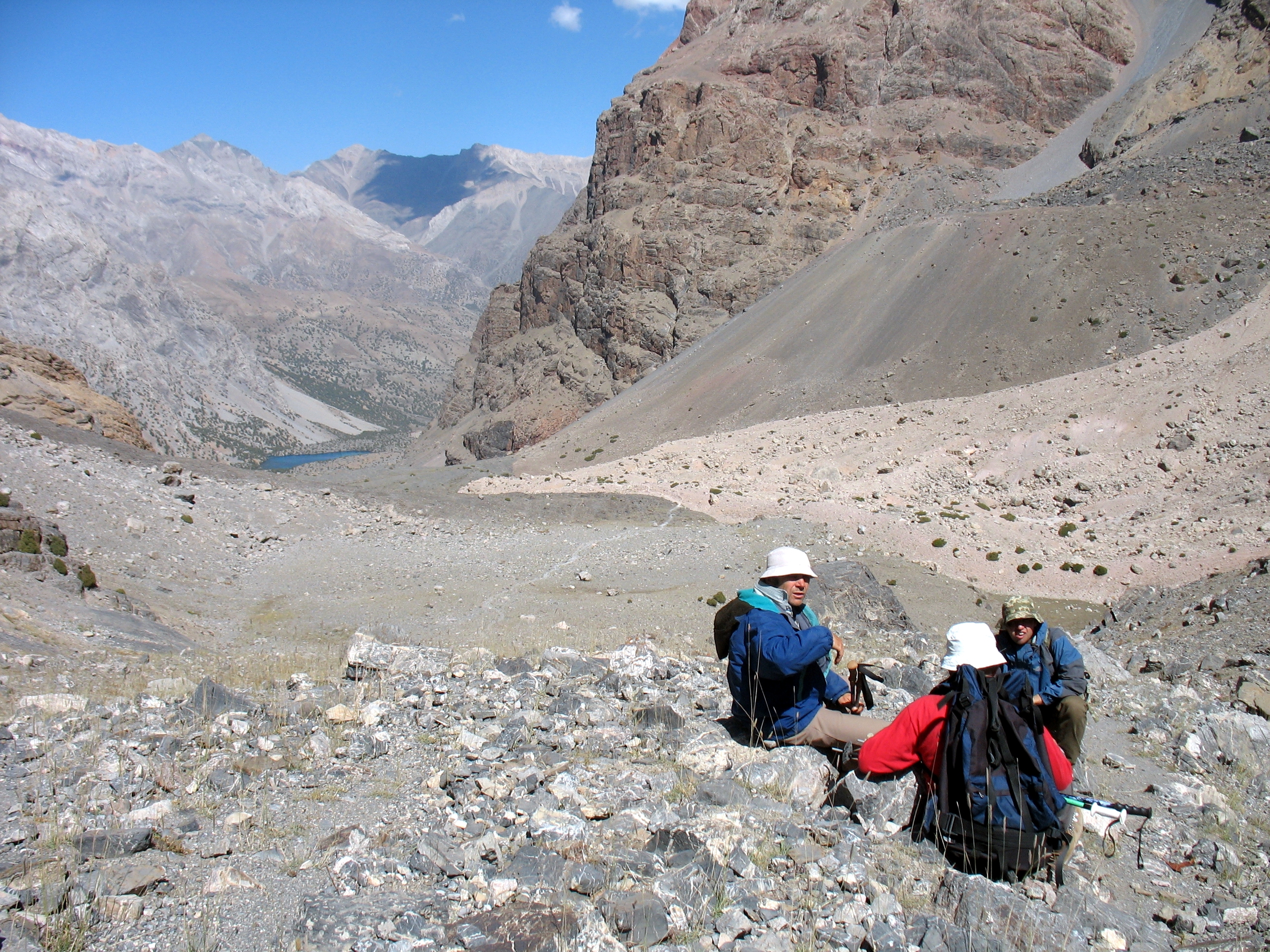 Це перекур десь на підйомі на одну зі ступеней завалу, далеко внизу видніються Алаудинські озера.