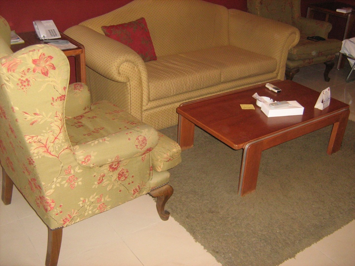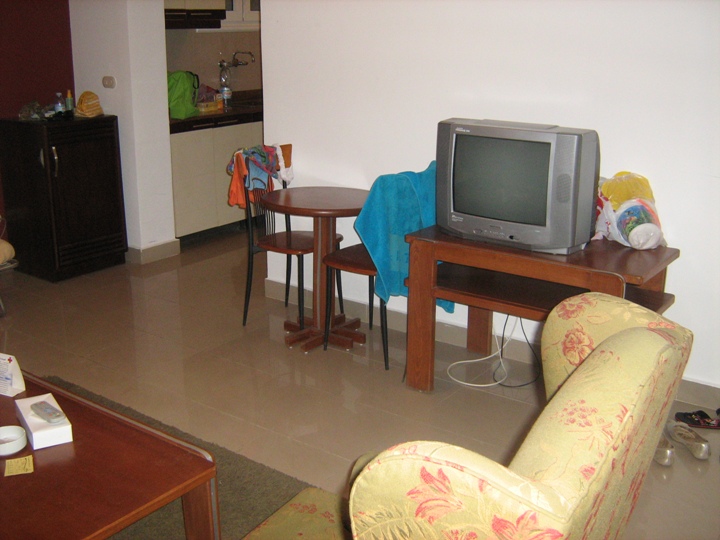 Мой "номер"- это гостинная, спальня, кухня, санузел и терасса. Площадь без терассы около 80 кв.м. Добротная деревянная мебель, мраморный пол, ковер у дивана и в спальне, ТВ, кондиционеры в обоих помещениях, на терассе 3 удобных кресла, столик и сушилка для белья.