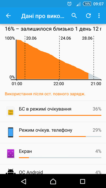 Телефон Sony Z3 Compact, прошивка крайняя 5.0.2, все стоковое ни каких оптимизаторов типа стамины, радиомодуль на ночь не выключался. Условия - ежедневно: пару/тройку звонков на пару/тройку минут, 3-4 смски, несколько минут Интернета (погода, валюта, почта) через EDGE, до десятка раз смотрел время/батарею, ну и будильник. Итог 8 дней и 9 часов на одном заряде, хотя телефон обещал еще сутки с копейками работы на остатках батареи, насиловать его не стал :)