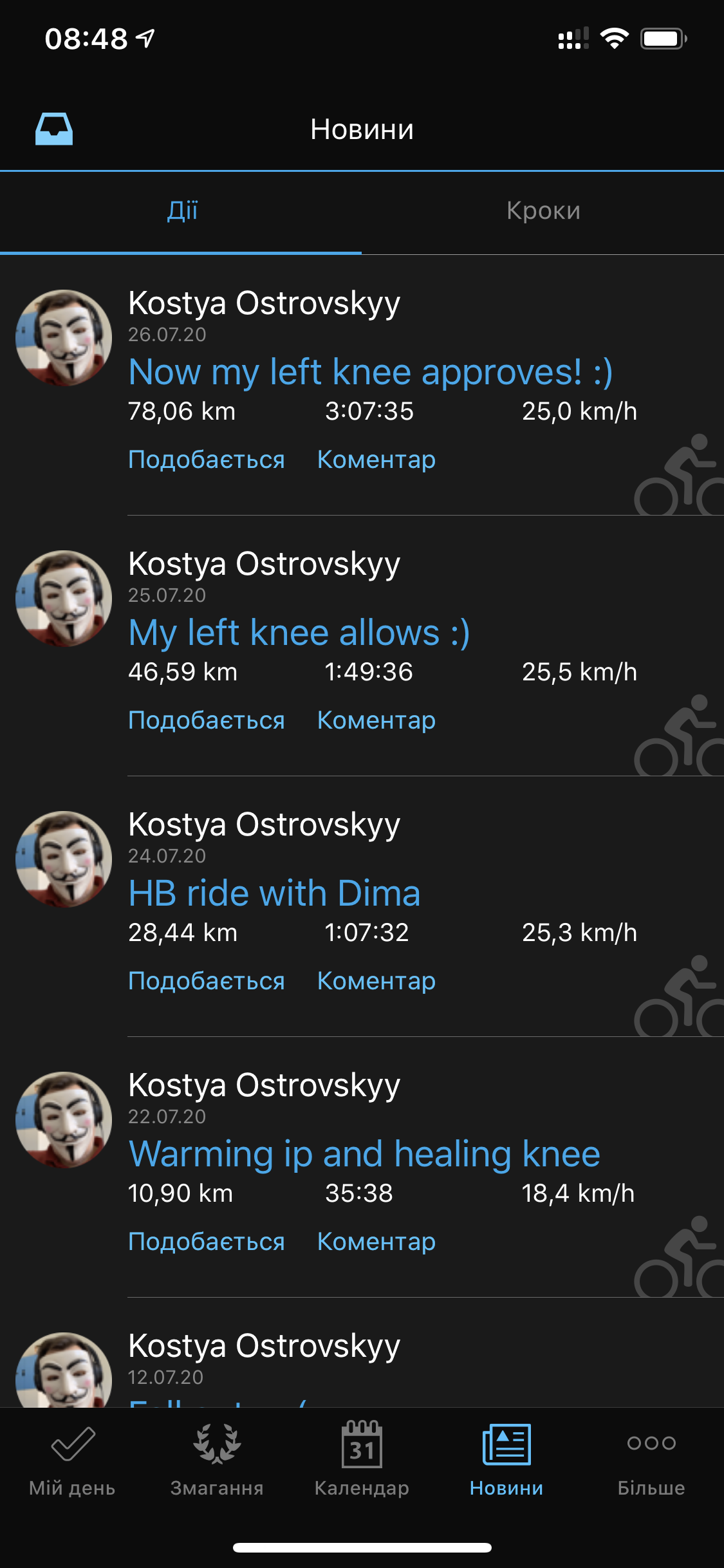 mutexx У меня все подтянулось в приложение и синхронизировались крайние заезды. Все функционирует, но красный баннер периодически мелькает. Вчера проехал 78 км, но в жару и в штиль. Приходилось несколькотраз останавливаться, чтоб вспотеть или полить себя водой.