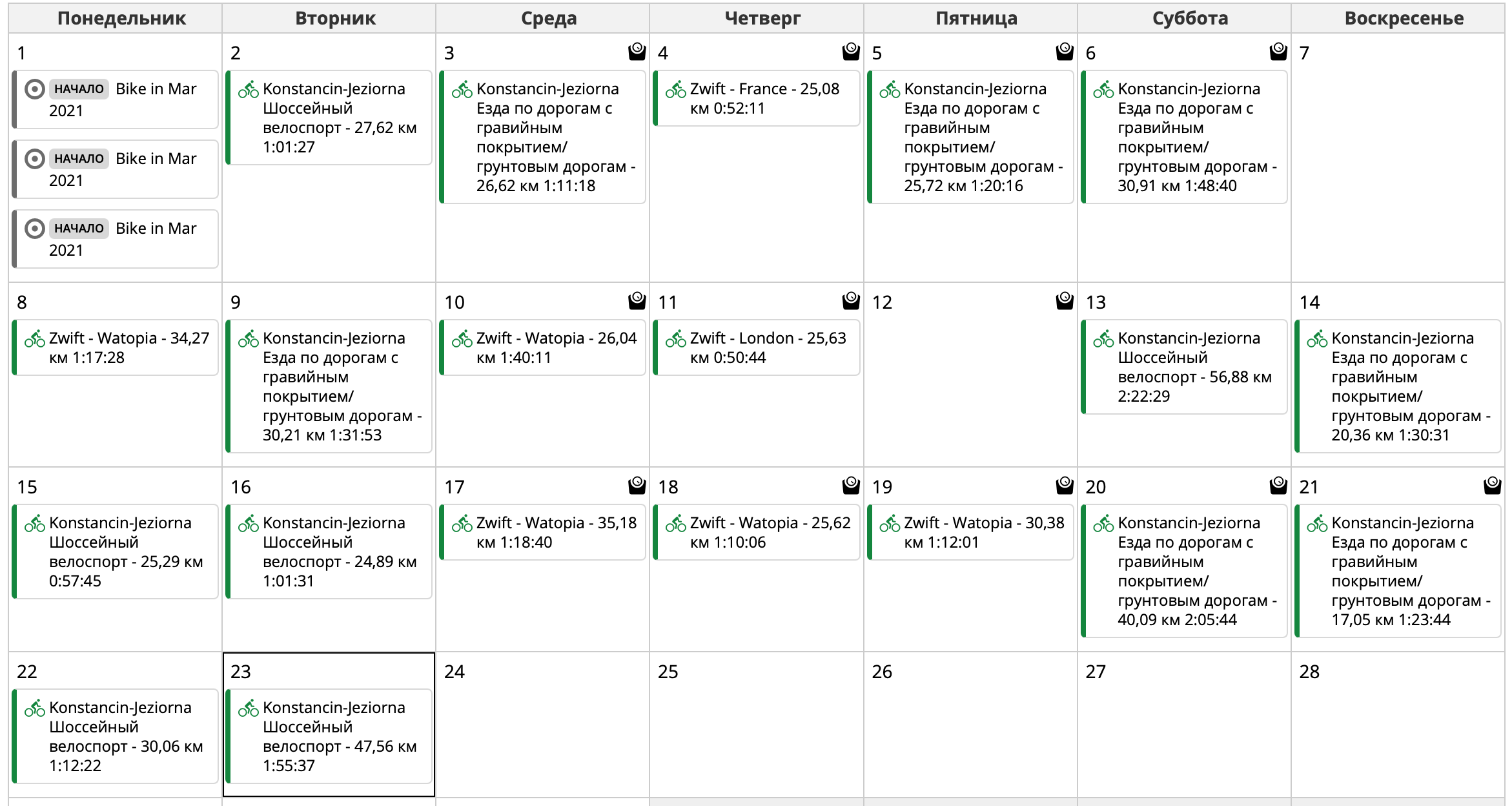 Боюсь сглазить, но не даром поляки первый день весны празднуют 21-го марта. Если прогноз сбудется, то планы на месяц выполню, и это будет мой самый продуктивный месяц. Кстати, сегодня почти полтос нон-стоп и на паре глотков воды довольно хорошо, но завтра надо делать перерыв - бёдра в ауте... Ну и +9 - это уже практически Африка! ПыСы. Заказал второй датчик каденса, а то постоянно забываю его перекидывать с велика на велик.