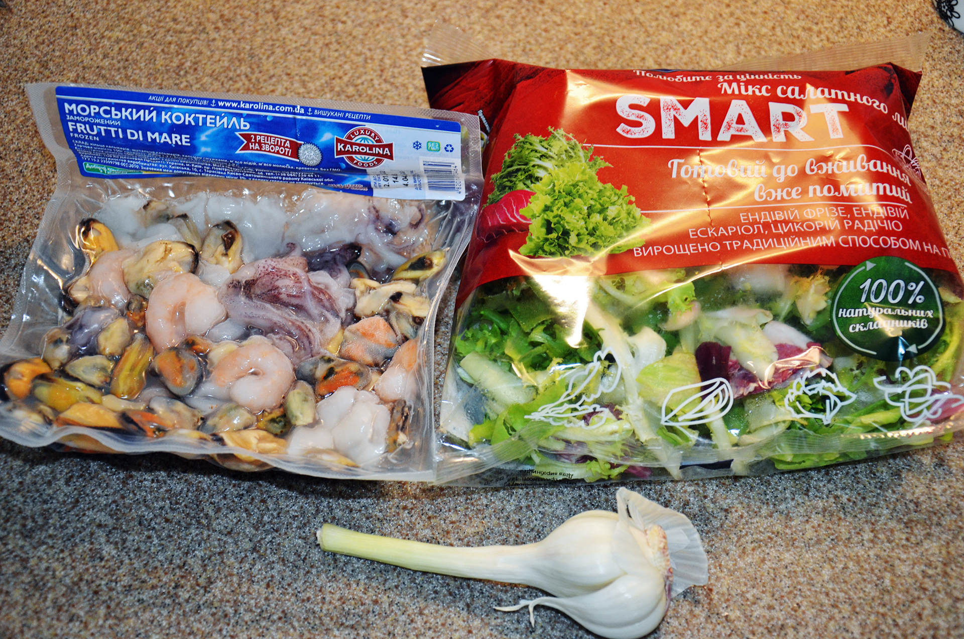 Ингредиенты по весу одинаково моркови, корня сельдерея и картофеля грамм по 200-300 морской коктейль, можно к нему взять в добавок пакет мидий (мне именно мидии очень нравятся в этом салате) пачку-две оливковое масло ложки три цедра лимона соль, черный перец микс салатов одну-две пачки Заправка: 5-7 зубчиков чеснока ложка меда ложки три оливкового масла сок половины лимона соль