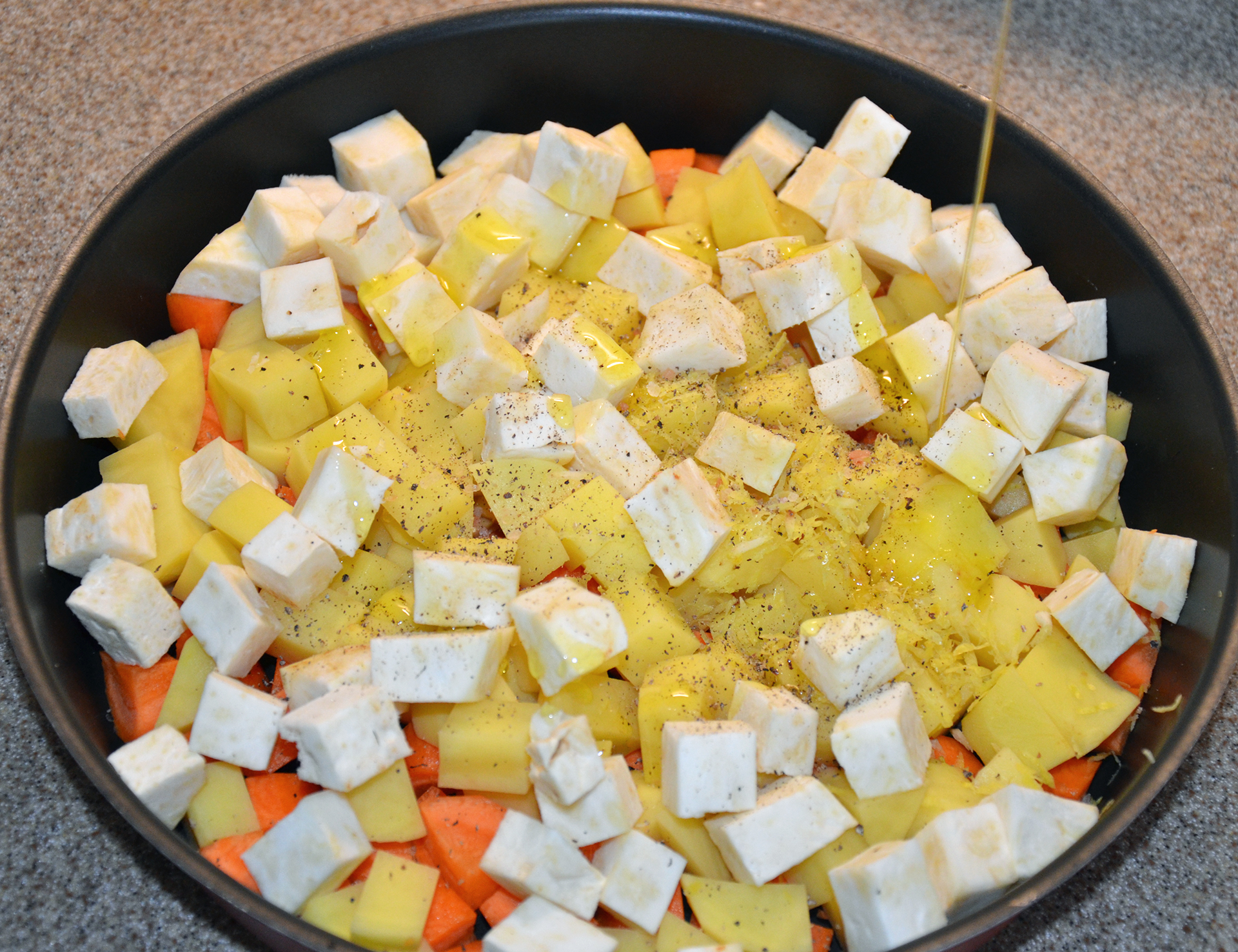 Приготовление Нарежьте кубиком морковь, корень сельдерея и картофель. Полейте хорошо оливковым маслом, приправьте солью, перцем и цедрой лимона. Положите рядом чеснок и запекайте при температуре 190 градусов 15 минут под фольгой. Затем достаньте чеснок, а остальное запекайте еще 15 минут без фольги.