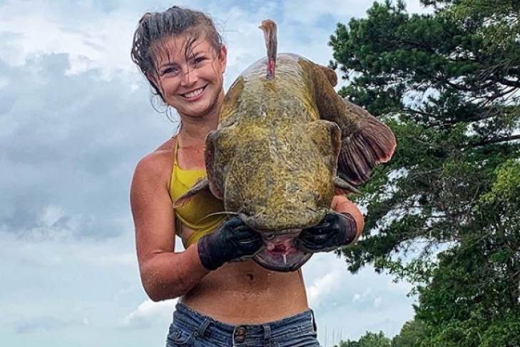 23-летняя Ханна Баррон, одетая лишь в бикини, шорты и специальную обувь, с головой погрузилась под воду и вынырнула уже с огромной рыбой. Девушка вытащила улов на сушу, одну руку засунув по локоть в пасть сома, а другой удерживая тушу.