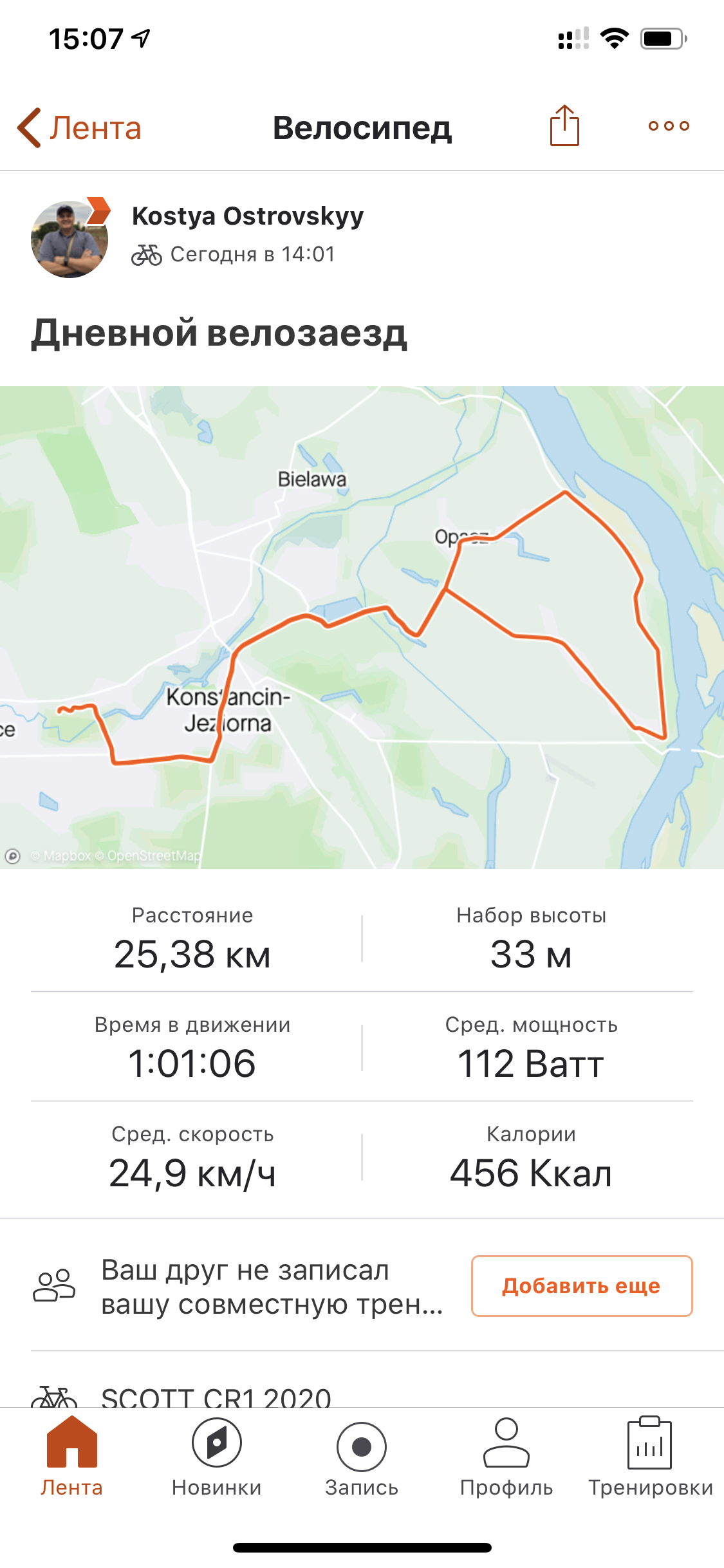После двух прогревочных недель на гибриде в Пн расчехлил шоссер. Сегодня психонул и выехал днем, пока солнышко и +19, хоть и ветренно. До 25 км/ч средняя уже доползла. Если бы штиль, было бы 27-27,5 км/ч точно.
