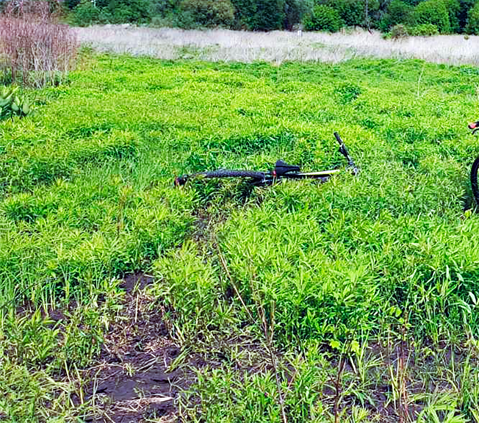 Сначала еще было более нормально - небольшая пересеченка, потом было поле, недавно перепаханное, а потом вот такие заросли без дороги с растительностью по колено, все это киллометров пять (вот где я мечтал о более мягком седле) и в конце просто кусты густые, пришлось велик метров 150 на себе тащить..