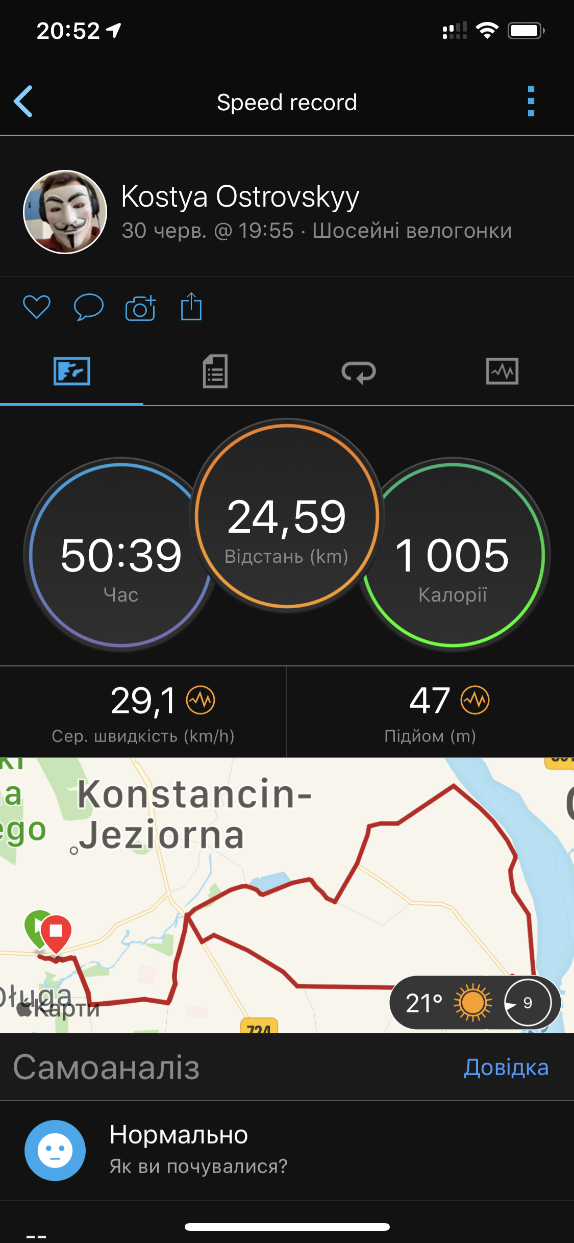 Контрольный спринт после работы. Прохладно, небольшой ветерок.