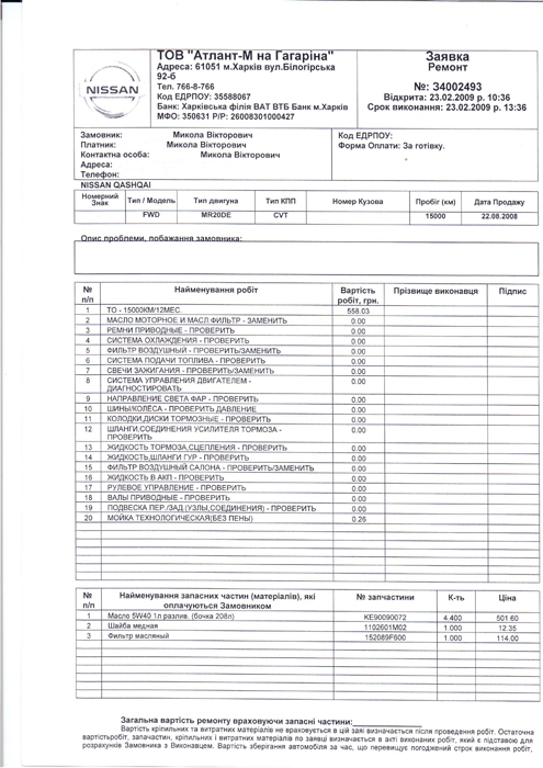 Если бы Вы приехали для обслуживания своего автомобиля на Атлант-М на Гагарина сегодня, то заявка на ремонт имела бы такой перечень работ: