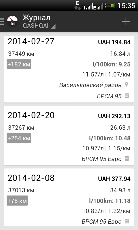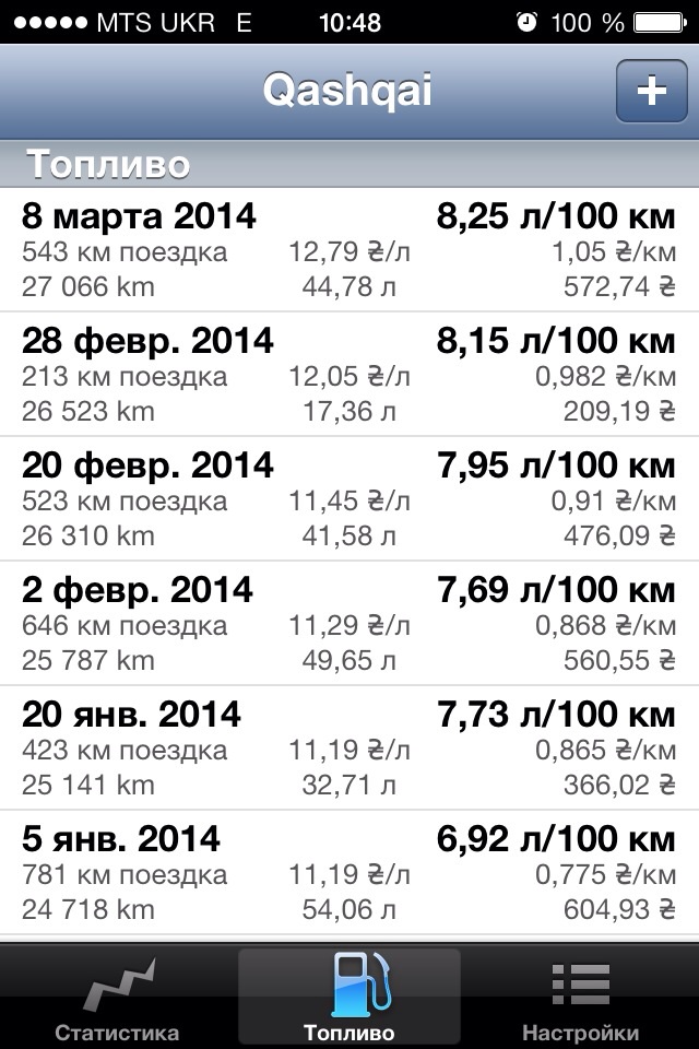 Вот мои последние заправки, практически езда только по центру в час пик и раз в неделю 50 км трассы возле Киева.