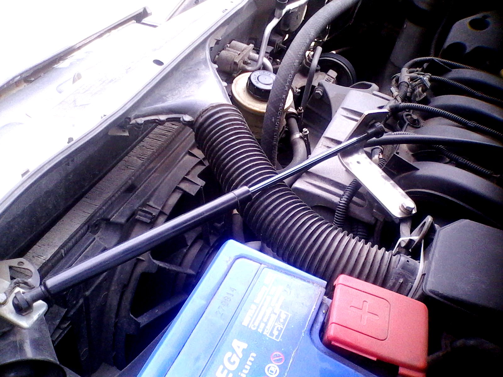 А еще придумалось мне сделать дополнительную опору двигателю из газового упора. Тоже ниче так получилось: уменьшились вибрации на некоторых режимах работы двигателя, да и как-то он стал мягче работать, а может мне кажется. Но польза есть однозначно. Правда надо будет переделать кронштейн, не очень он мне нравится и поменять на новый газовый упор. Этот старый стоит, полуживой от верхней части задней двери. Туда поставил новый, ну а этот же не выкидать, он еще что то там пыжится. Вот и придумалось его присобачить. :D