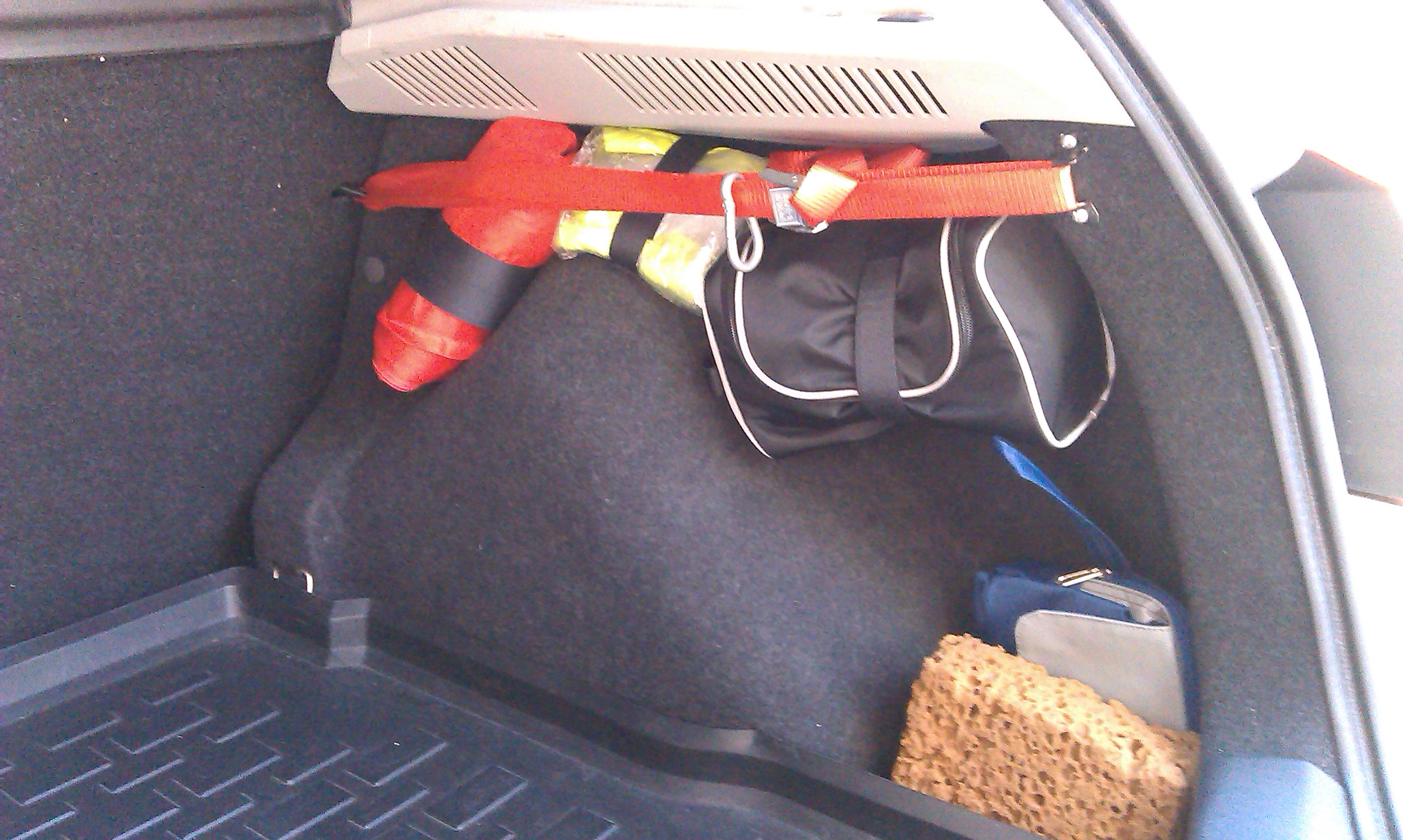 Итак, очленивые ручки возвращаются! Ремень с карабином в глубине багажника иногда помогал, но в то же время и раздражал. Почему? Да просто неудобно тянуться с тяжёлым пакетом в глубину багажника, чтобы пристегнуть-отстегнуть, особенно когда бампер имеет состояние повышенной грязности. А ещё в этот день было скучно и хотелось чем-нибудь заняться. Решено сделать петлю для ремня с карабином и закрепить её так, чтобы ремень ремень закрепить ближе к задней части багажника. Из куска металлической пластины вырезал болгаркой некой формы деталь