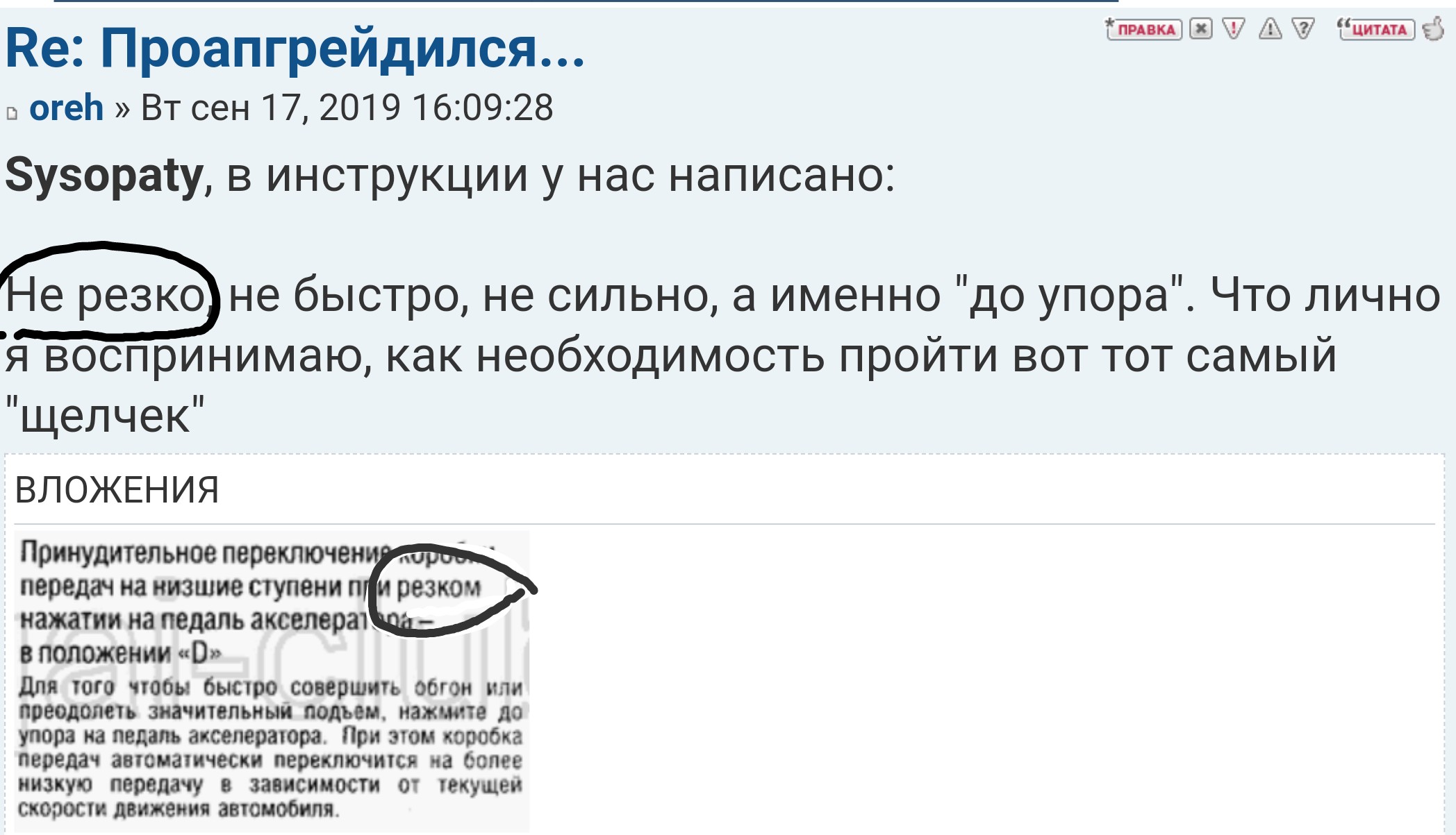 По моим наблюдениям, просто нажать недостаточно на большинстве машин. Если не "продавить", машина пытается справится без понижения передачи. Что приводит к достаточно плачевной ситуации, когда машина выжала всю мощность с возможных оборотов на "текущей передаче" (взял в скобочки, так как обсуждаем вариатор в том числе), без понижения, а дальше все, машине нужно как-то нарастить обороты, а момент утерян. И ты как побитая собака слезно просишь притормозить и пытаешься влезть в ряд, с которого только что выехал, пытаясь реализовать обгон впереди идущей машины.