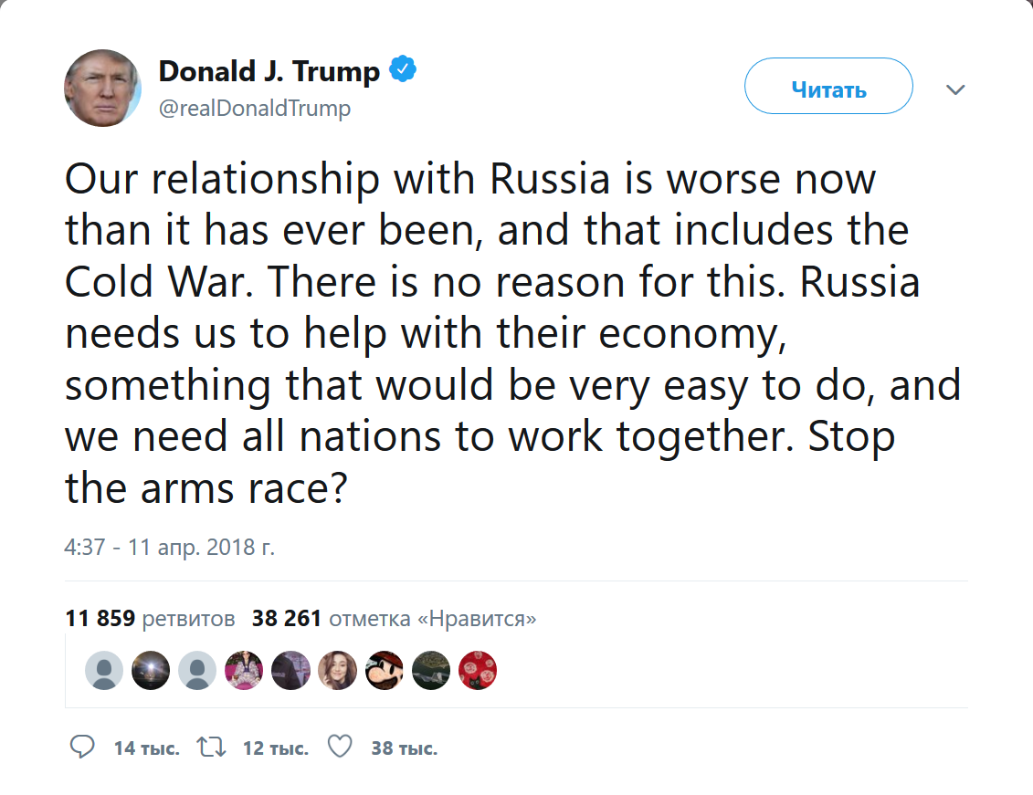 «Россия обещает сбивать любые ракеты, выпущенные по Сирии. Готовься, Россия, они прилетят. Они будут хорошие, новые и «умные»… .», — написал президент США.