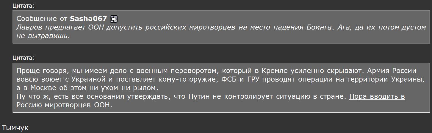 "Когда мы слышим на фоне этих очевидных фактов призывы к России обеспечить доступ международных экспертов к месту катастрофы, у меня просто не остается никакой другой реакции, как предложить, чтобы Совет безопасности принял резолюцию… если они уверены, что только Россия может это сделать, пусть примут резолюцию, приглашающую Россию развернуть свои миротворческие силы и обеспечить периметр безопасности вокруг места катастрофы. Если уж ничего другого с киевскими властями сделать невозможно. Это, конечно, такое предположение, исходя из абсурдности нынешней ситуации, но абсурдность тоже должна иметь свои пределы", — сказал Лавров