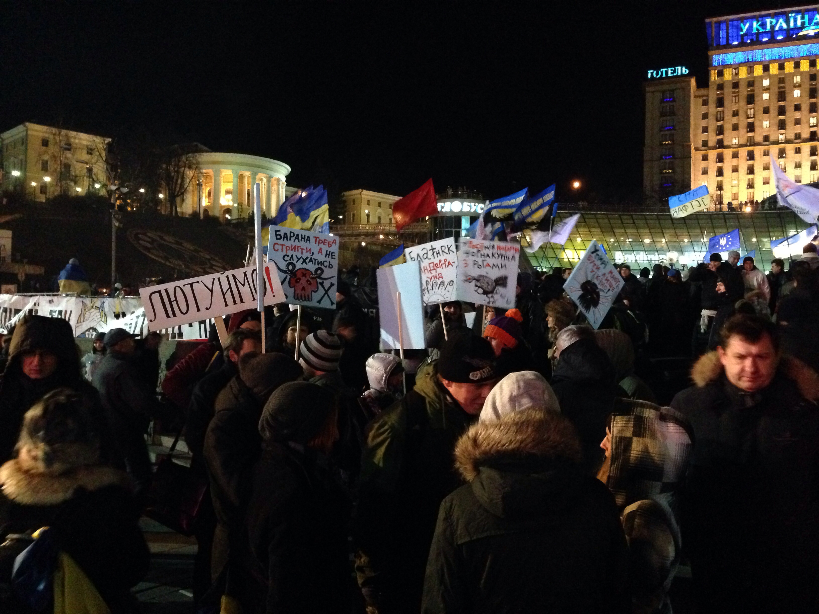 Слід вказати, що знаходячись на Майдані я не любив й не хотів лазити біля трибуни - все ясно й без моєї моськи в камерах, й друзі мої також, до речі, не тусовщики біля мікрофону - стоїмо бо потрібно стояти, без вилізання "покерувати". Але краєм вуха слухали , що хто говорив. Данилюк, Коханівський, Іванов - виступали з проханням не полишати Майдан, якщо влада не підпише , а вимагати відставки президента. Наєм й далі , інші - навпроти : ніякої політики , лишень підпис.