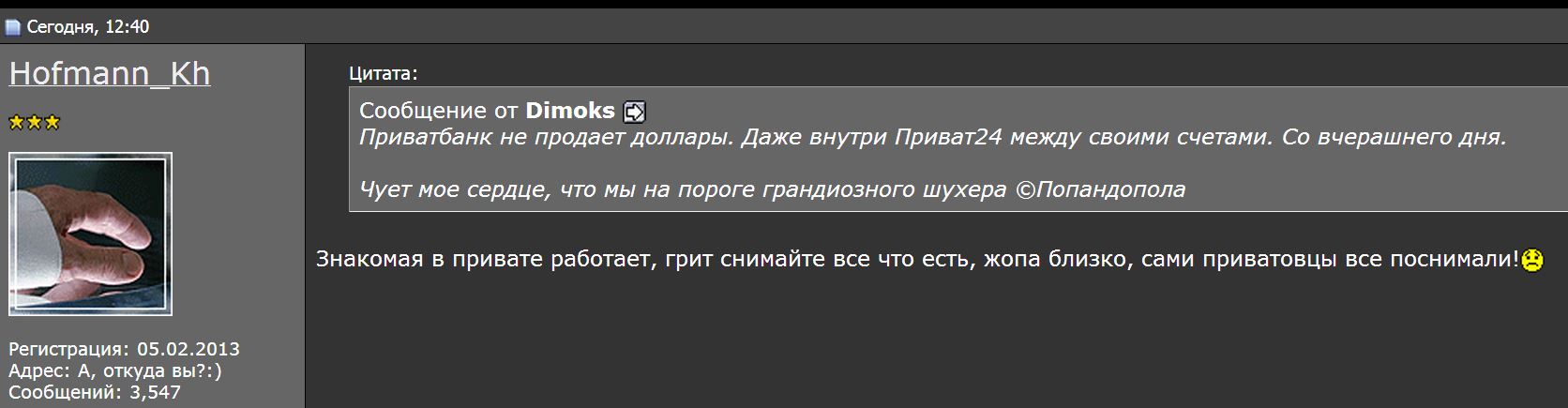 Kostya писал(а):Ну, хєр ні хєр, але бакси купити в Києві в Чт та Пт було неможливо. Банкам неможна іх тепер купувати на МВБ. Тесть сьогодні пенсію не отримав. Кажуть, немає грошей у банку... Отакє...