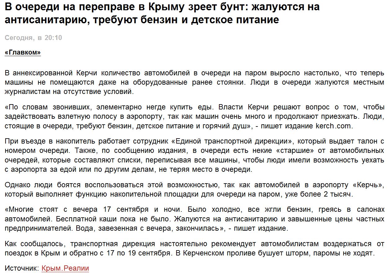 «Сейчас в порту «Крым» все накопительные площадки полностью заняты автомобилями. Во избежание транспортного коллапса на переправе Единая транспортная дирекция рекомендует воздержаться от поездок в Крым и обратно с 18 по 20 сентября и по возможности переждать непогоду на материковой части России и полуострове», — говорится в сообщении дирекции.