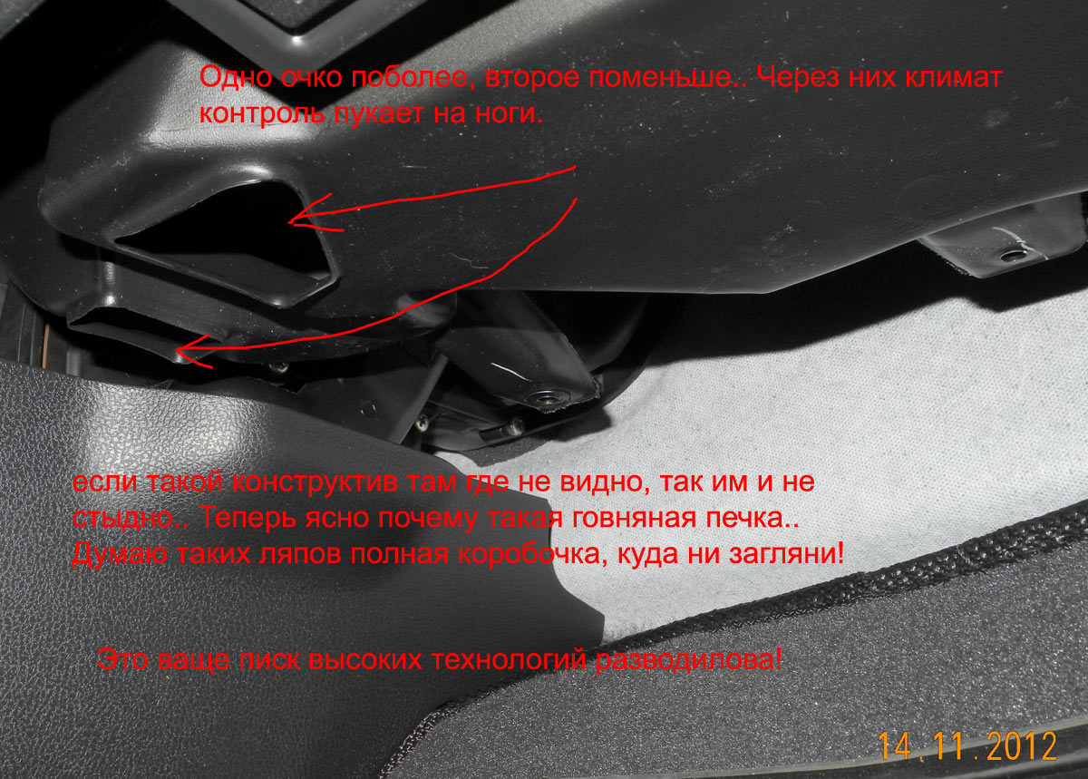 Ладно, если не лезе голова под бардачок, запихнул я туда фотоаппарат, и о чудо ! Вижу гения технической мысли - узкопленочный япп придумал в воздуховоде просто вырезать две дырки ножом, даже надфилем не подравнял.. Оно и понятно, нахера хохлам да и москаликам хороший обогрев ног, все равно никто незаметит на фоне и так паршиво работающей печки.. Кстати может ее там просто нет? а есть дырка из моторного отсека ? куда поступает тепло когда на шурупе болтающаяся зслонка отворится супер навороченным мотрчегом от климат контроля???