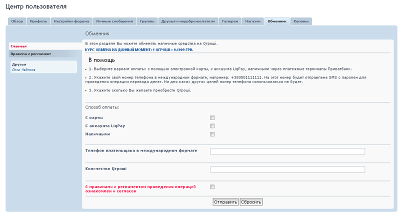 Зайдите в "Центр пользователя", закладка "Обменник".