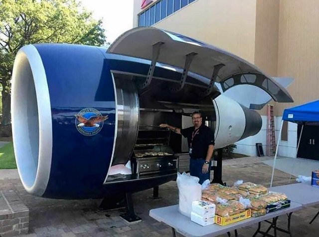 А вот, чтобы все были сыты и довольны, парни из Delta Airlines Tech Ops решили подойти к делу серьезно. Они превратили списанный двигатель Pratt & Whitney PW2000 с Boeing 757 в «реактивный» гриль-барбекю, который может поджарить до 500 гамбургеров в час.