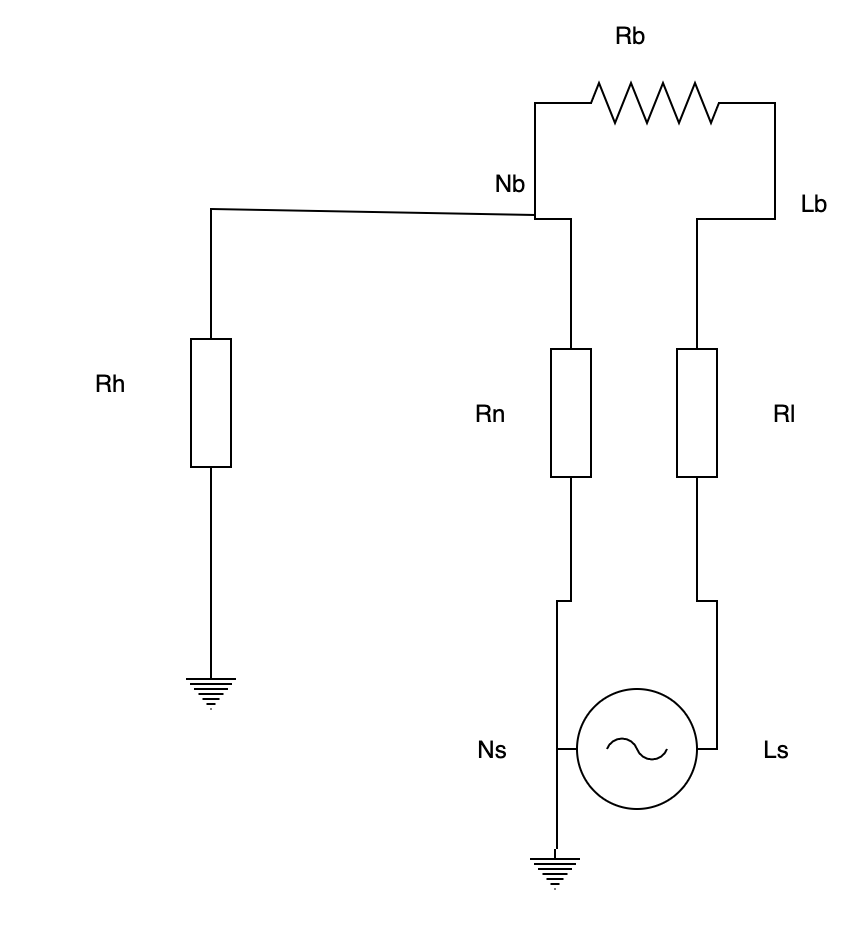 Ls - напряжение фазы на щитке, Ns - ноль на щитке, Lb и Nb - напряжение фазы и ноля на контактах ТЭНа бойлера, Rl и Rn - сопротивление фазового и нулевого проводов от щитка к бойлеру, Rb - сопротивление бойлера, Rh - сопротивление человека.