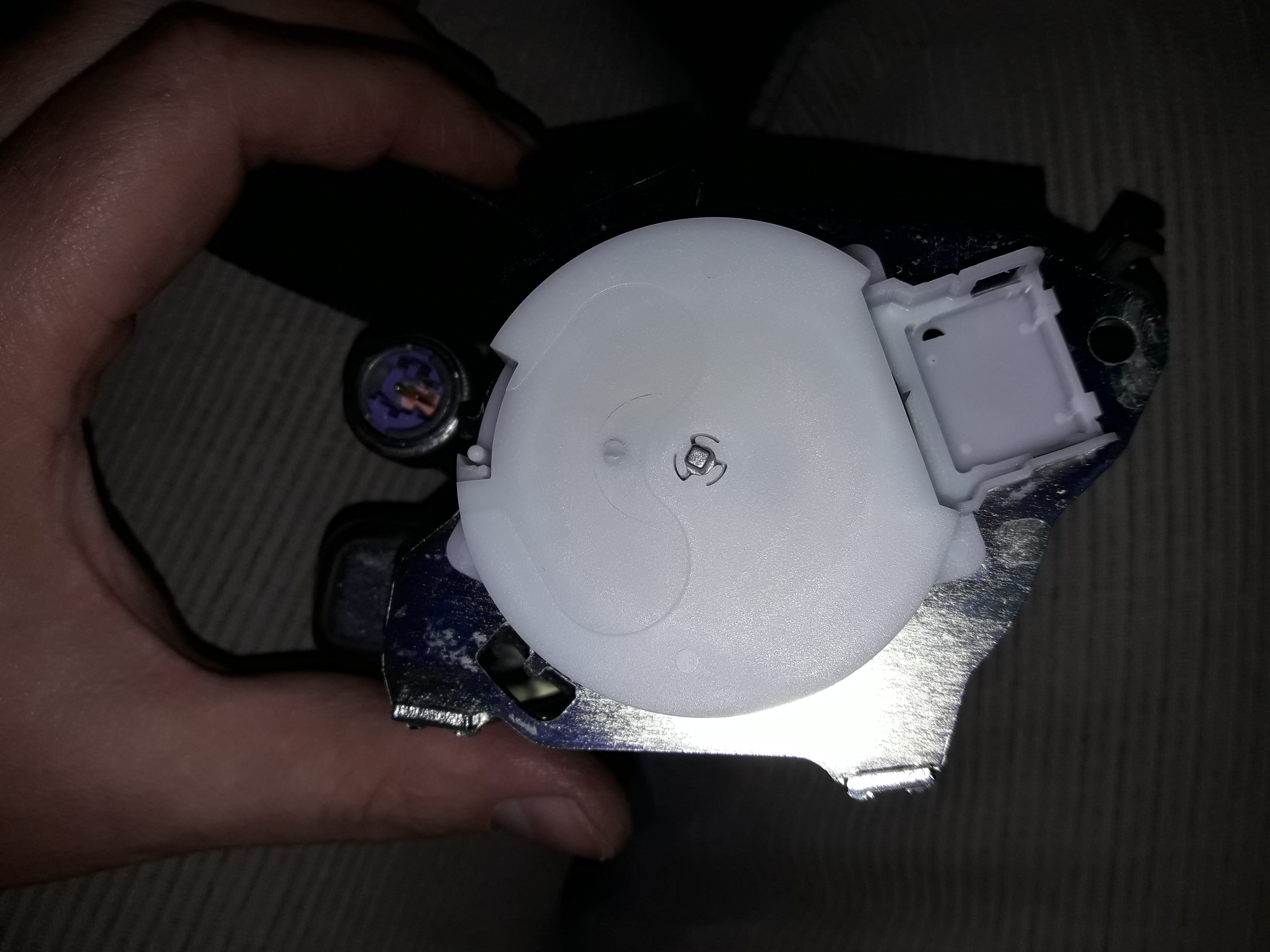 Далее снимаем пластиковую крышку с шариковым механизмом, принцип разборки как на всех пластиковых клипсах - выдавить сердцевину и вытолкнуть.