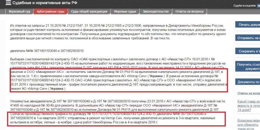 Згідно із судовими матеріалами, рік тому міноборони РФ уклало держконтракти на модернізацію чотирьох літаків Ан-124 з ремонтом їхніх двигунів Д-18Т для своїх потреб у 2015–2017 роках.