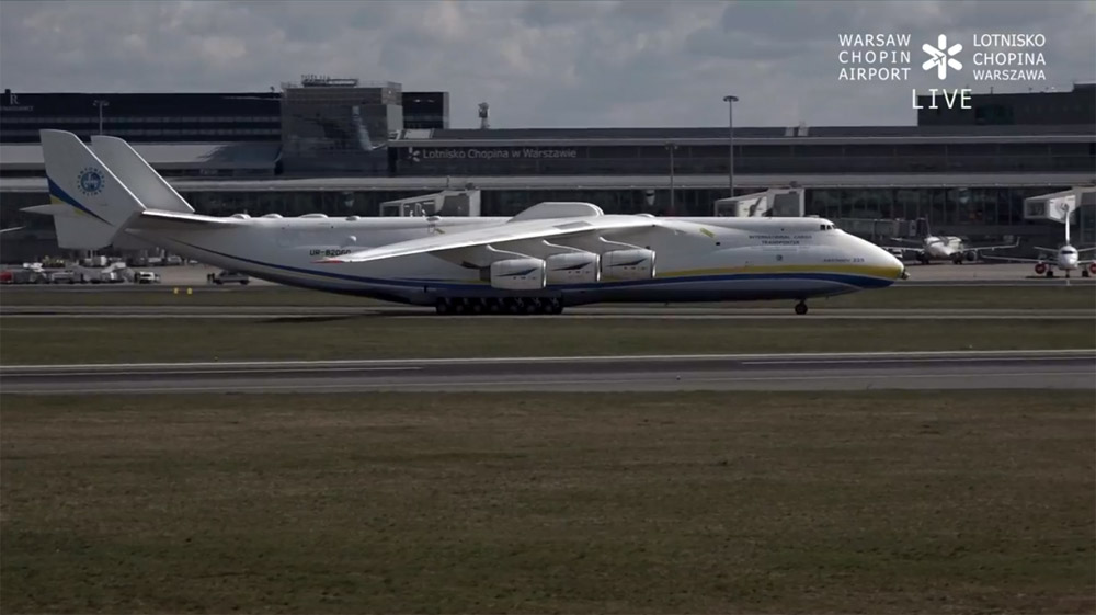 Самый большой в мире самолет Ан-225 «Мрия» совершил круг почета перед первым в истории приземлением в варшавском аэропорту Шопена 14 апреля.