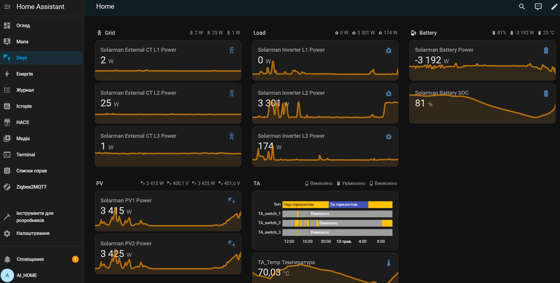 У інверторів DEYE є smartload, але воно просто вмикає навантаження на порту генератора по 3 фазам. Ціль забирати по максимуму на бочку те що може дати сонце в даний момент. Тому на кожен тен поставив розумну релюшку. Також релюшку поставив на циркуляційний насос опалення. Також поставив пару датчиків присутності і пару датчиків температури.