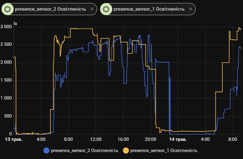 Один в кімнаті зі східної сторони, інший з західної. Смикати штори по рівню освітленості мабуть таке собі... Бо на графіку видно сильні коливання, коли нахмарило.