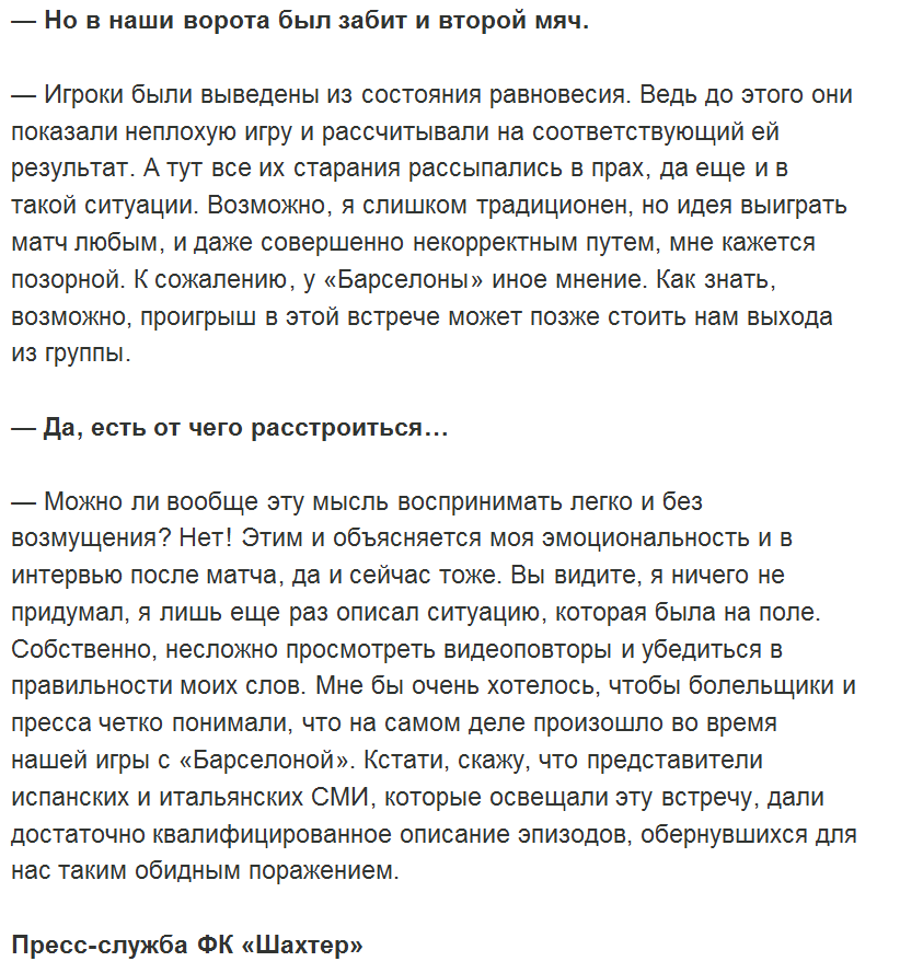 «Вы, наверное, видели, что после первого гола Адриано во время ввода «Нордшелланном» мяча все мои футболисты разошлись. Стокхольм взял мяч и дошел бы до ворот, если бы не Степаненко. Если вы думаете, что после скандала, тех оскорблений и толчков, которые были на поле, мои футболисты выйдут и позволят себе забить, то глубоко ошибаетесь. Единственное, о чем я просил в перерыве, – чтобы они доказали всем, что намного сильнее, и выиграли этот поединок абсолютно. Они так и сделали», - приводит слова главного тренера официальный сайт «Шахтера».