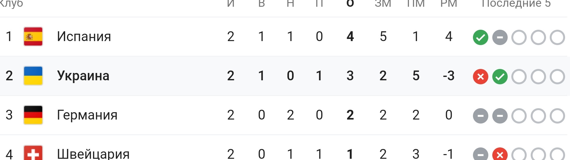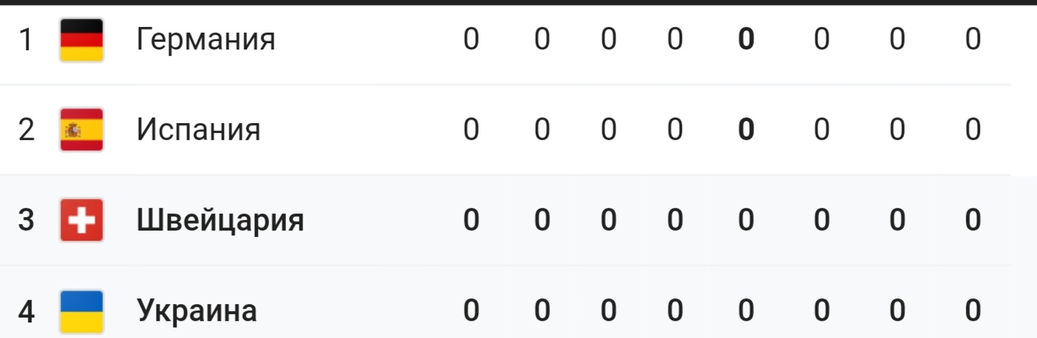 Украина занимает первое место в группе с тремя баллами после победы 2:1 над сборной Швейцарии. Испания же идет на втором месте - с Германией они сыграли ничью 1:1.