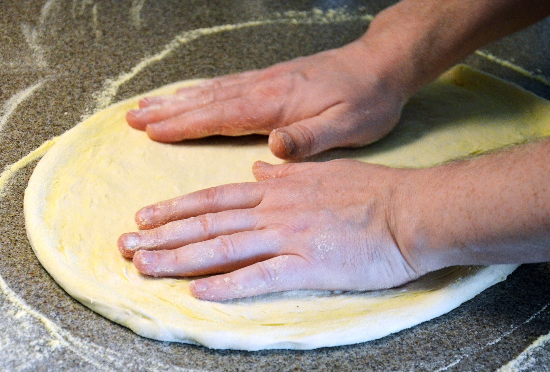 Формируем круглые заготовки. Подминаем внутрь, закатываем в шар. Если не умеете, защипываем. Должны получится упругие шары, которые держат форму. Смазываем маслом и перекладываем в какую-то закрытую емкость. Оставляем на окончательную растойку. Опять же, зависит от того где и как делаете. На час-полтора в общем. Заготовка должны быть податливая, без "внутреннего напряжения". У меня на нескольких фотках видна первая заготовка, которая "не достояла". Такие заготовки тяжело раскатать в форму для пиццы. У них есть это напряжение. Ты ее растягиваешь, а она опять сжимается. Если тесто плохо вымешано было, в нем плохо развита клейковина, или не дать заготовке правильную растойку, так оно вообще может рваться. Если раскатали диаметр заготовки больше чем надо, просто приподнимите над лопатой его и хлопните об лопату, тесто "сбежится", уменьшится. Я формирую заготовку всегда больше чем надо по диаметру, а потом такими похлопываниями аккуратно "собирают" тесто до нужного мне диаметра. Когда формируете заготовку, сначала пальцами формируете "бортик" пиццы. Кладете заготовку более "сырой" стороной вниз и вдавливаете подешчками пальцев, формируя бортик. Бортик как будто будет "выкатываться" из под ваших пальцев. Потом тесто переворачиваете, более "сухая" сторона была снизу, припыливаете ее мукой (я беру часть муки для пиццы и часть кукурузной мелкосмеленной муки - пицца когда запекается, получается такое приятное похрустывание из-за этого и прикольный привкус). После этого аккуратно ладонью выравниваете холм. Но чтоб толщина "холма" спадала с центра к краям. Когда будете растягивать заготовку, тесто должно расходиться равномерно, чтоб толщина по всей заготовке была одинаковой. Давить ни в коем случае нельзя. Иначе вы уберете всю пористость с теста. Поэтому никакого давления, никаких скалок и т.д. Только растягивание. Будете давить - получите тесто как "русских пряниках". Как сформировали "холм". Начинате аккуратно разводить руки в стороны, движение руками букво "V". Пальцы упираются в бортик и делаете такие V-образные движения. Смотрите где тесто тоньше, где толще. Растягиваете "где надо". Пока не научитесь будет тяжело. Но зато потом, можно растянуть пиццу за пару минут в идеальный круг, с идеальным бортиком. Если у вас правильно тесто, правильно расстоявшееся, с правильной пористостью, правильно развитой клейковиной.. и вы все правильно делаете руками при растягивании заготовки..