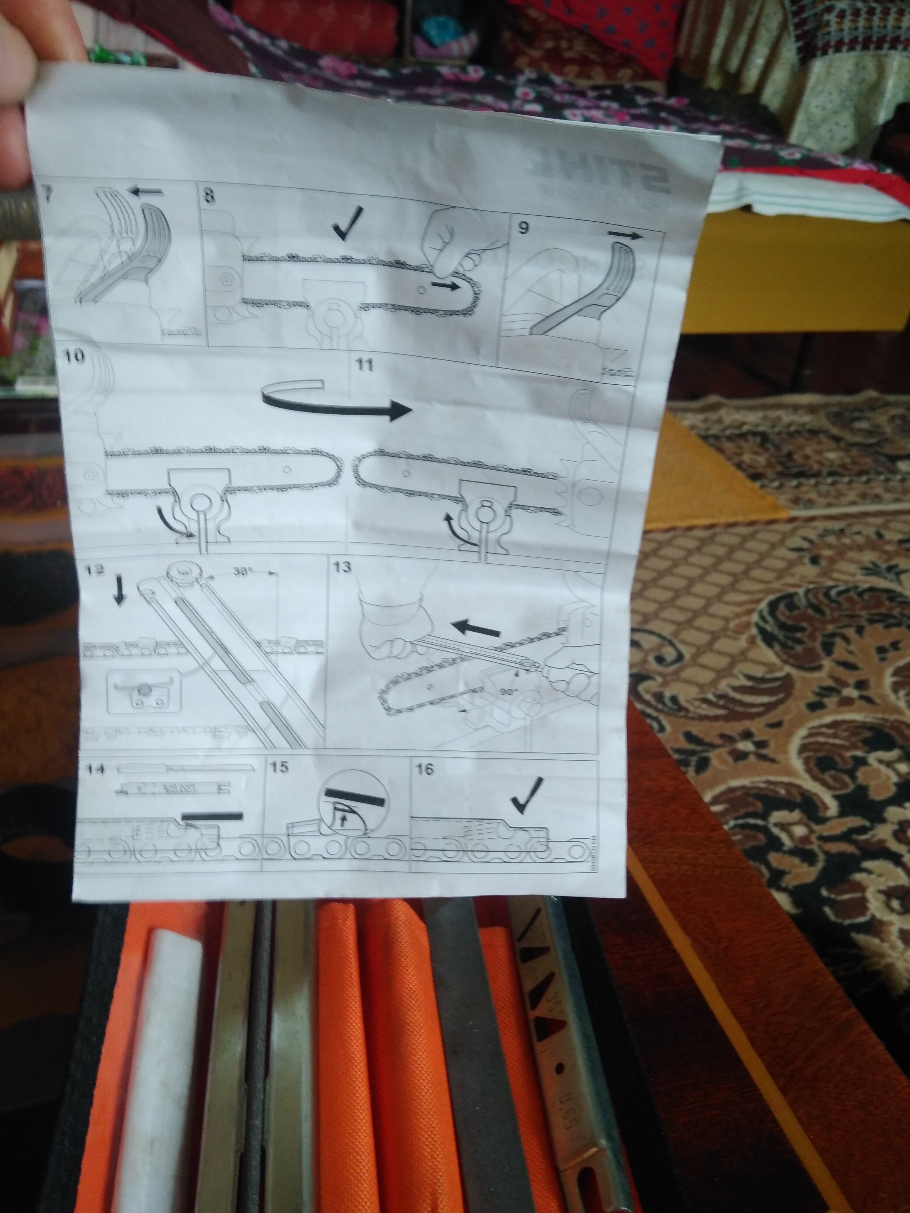 На приспособлении отмечены углы, по шаблону сверяю. Важно после заточки, спилить в соответствии с высотой зуба режущего ещё и зуб, определяющий глубину реза. Все это легко проследить по шаблону. И ещё мне в сервисе порекомендовали пользоваться попеременно двумя цепями, чтобы шла равномерная выработка на звездочке сцепления, тянущей цепь.
