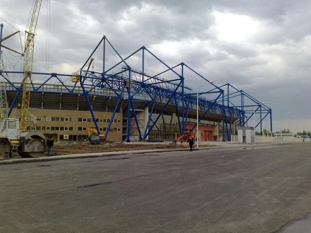 В конце рабочего дня заскочил на "обьект". Старые трибуны перестраиваются и достраиваются вверх. Со всех сторон асфальтируют все: от стоянок до дорожек. Похоже на муравейник. Готовность по моему под 80% примерно.