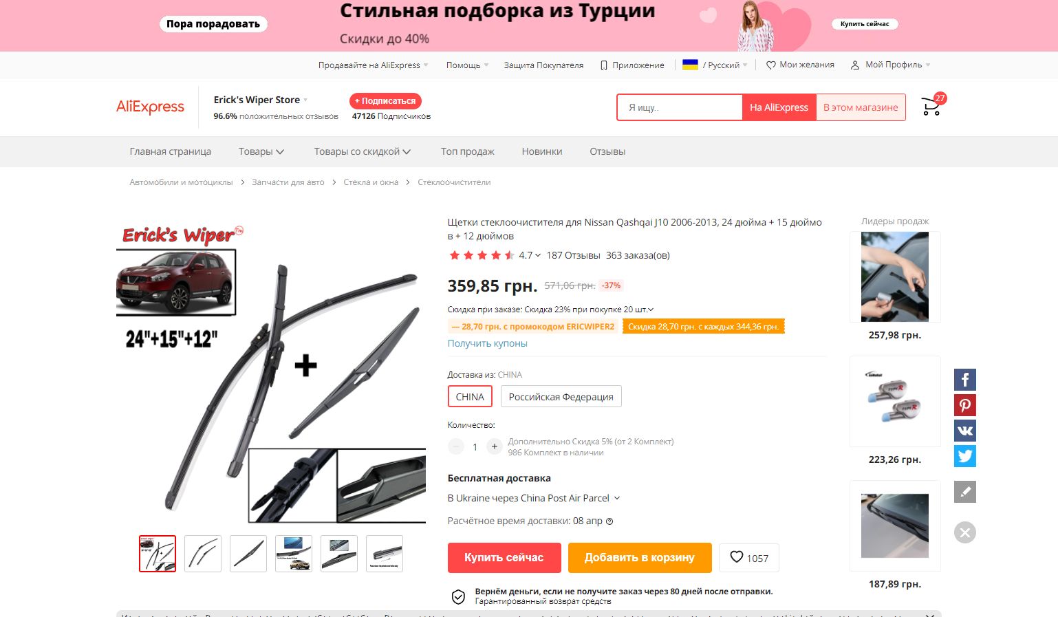 571грн,не так уж и мало...при традиционном китайском качестве.Отзывы тоже -у кого сразу полосят,у кого через неделю.Задний дворник традиционно китай-с одним коромыслом,никогда чисто вытирать не будет на нашем стекле..Так себе,имхо...