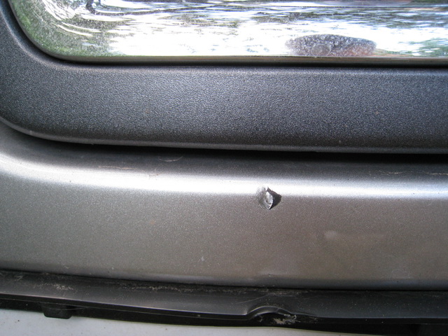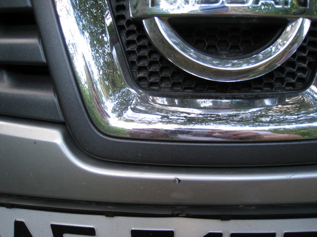На выходных ездил на дачу, так вот там какие-то с..е соседи чего-то вкопали почти прямо на дороге металлический штырь арматурного типа, еще и не высокий и никак не выделенный например цветной краской. Вообщем немного на него наехал передком, основной удар приняла на себя номерная рамка и номер но досталось и верхушке бампера, в результате чего образовался вертикальный скол около 8 мм в длину и 3 мм в ширину (см. фото). Маленький, а не приятно. Хочется заделать. Понятно, что пластиковый бампер ржаветь не будет, но глаза мозолит.