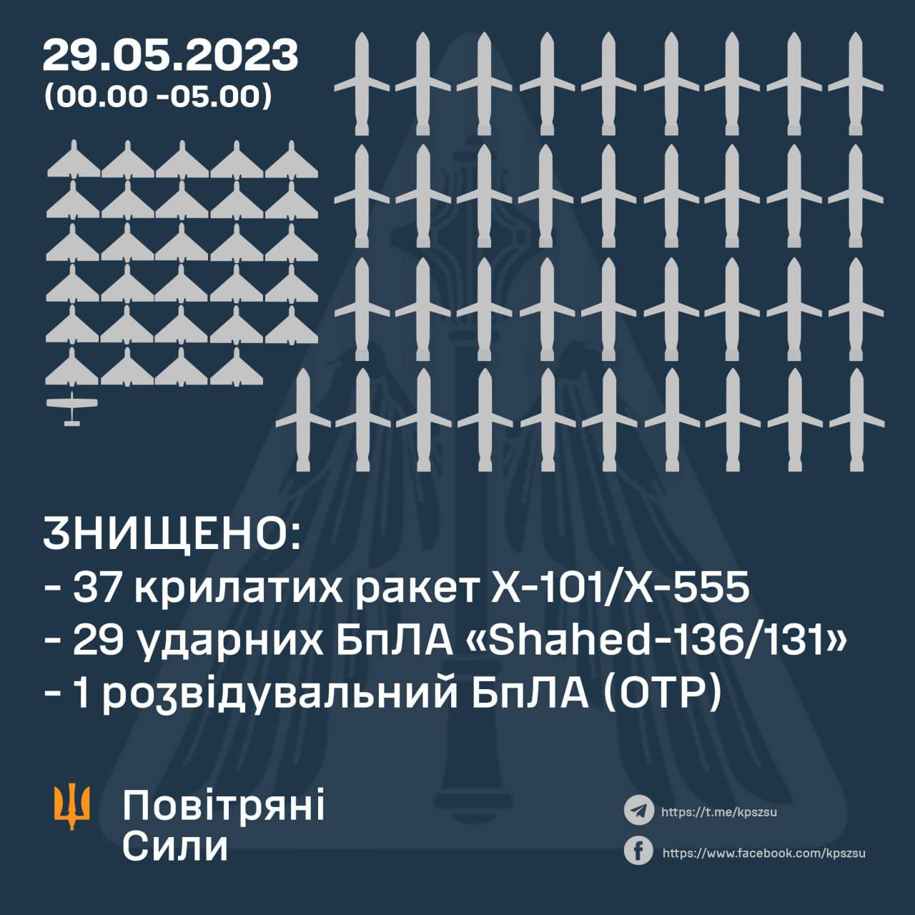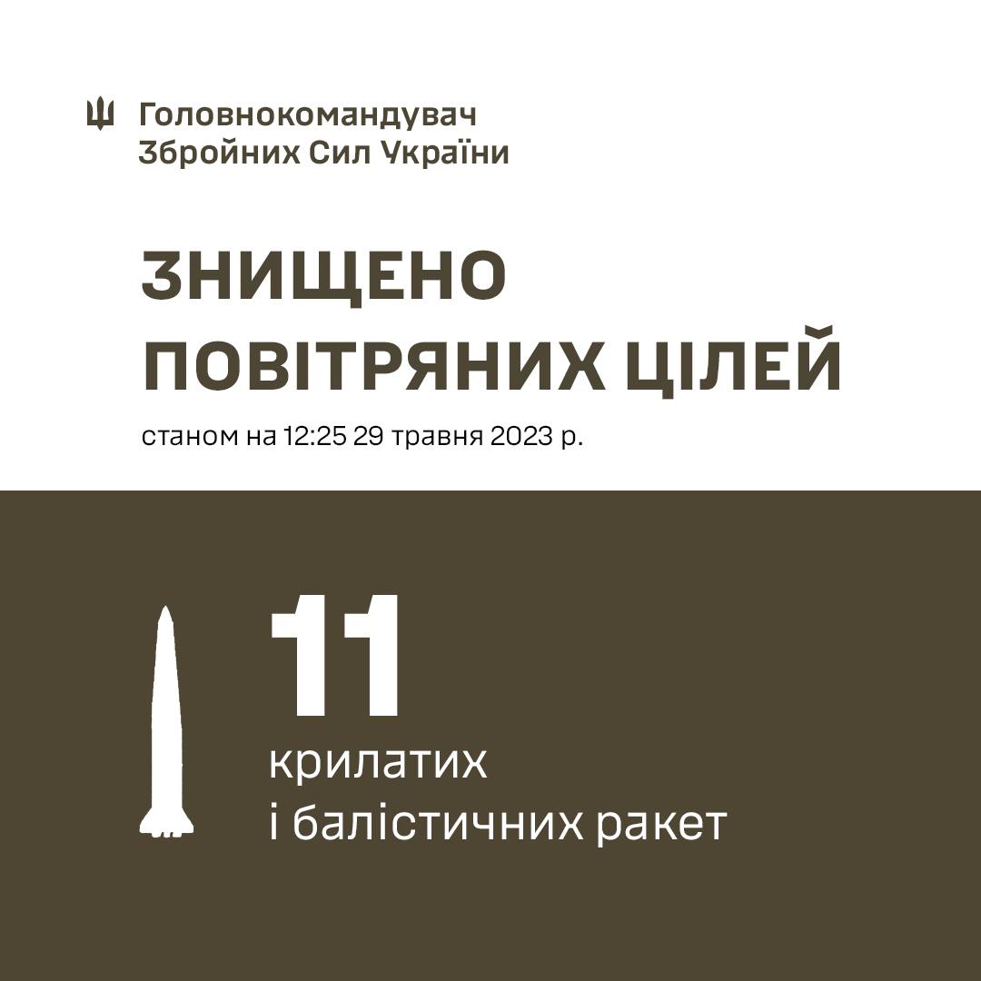 01.05: 15 з 18 х101 03.05: 21 з 26 шахідів 04.05: 18 з 24 шахідів 05.05: 2 з 2 шахідів 06.05: 8 з 8 шахідів + 1 кинжал 08.05: 35 з 35 шахідів 09.05: 8 калібрів + 15 х101 з 17 + 3 шахіда 13.05: 17 з 21 шахідів 14.05: 18 шахідів, 3 х101 15.05: 4 шахіда 16.05: 6 кінжалів + 9 калібрів + 6 шахідів (10 іскандер або с400) 17.05: 6 з 6 калібрів, 21 з 22 х101, 2 іскандер-к, 2 шахіда 18.05: 3 калібра + 16 з 22 шахідів 19.05: 20 шахідів 20.05: 4 шахида 21.05: 20 шахідів + 4х101 + 5х22 + 2 искандер м + 5 с300 22.05: 6 шахідів 23:05: 4 шахіда 24.05: 36 з 36 шахідів 25:05: 23 шахідів з 31, 10 з 10 х101, 7 с300/400 27.05: 54 шахіда (52 вбили)
