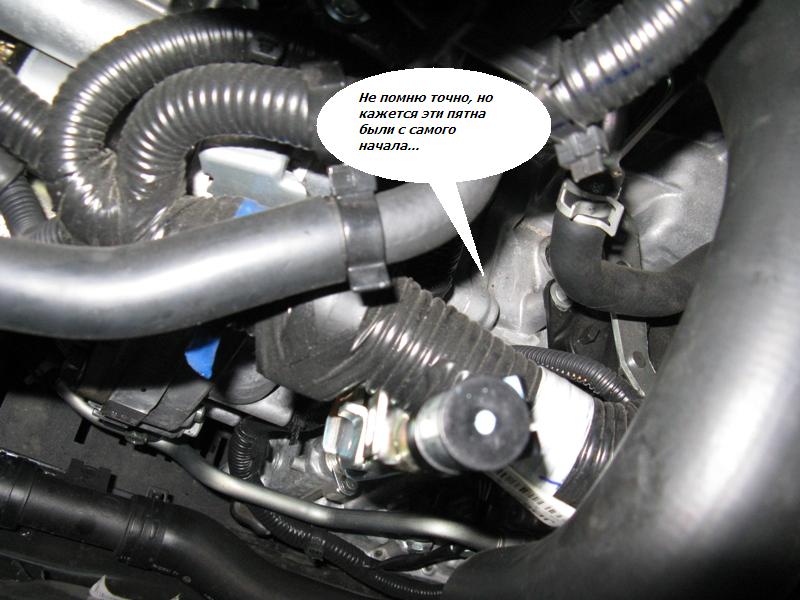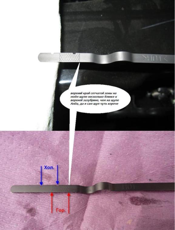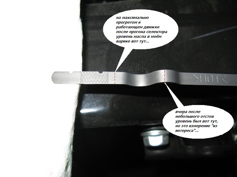 Думаю, наоборот - щуп будет мокрым выше всех отметок... Масло ведь стечёт в картер со всех деталек. Вчера, когда мерял не по технологии га остывающем движке минут через 15-20 после выключения зажигания, уровень был повыше, сегодня, на работающем пониже. Фотки ниже всё поясняют... Несмотря на то, что уровень у меня оказался на 2-3 мм выше сетчатой зоны (движок был максимально разогрет, а селектор был прогнан прямо перед замером несколько раз + не могу гарантировать идеально горизонтальной поверхности - дело было поднавесом на стоянке около Метро), думаю, что проблем не должно быть. Обсмотрел всё вокруг, в том числе и поддон, где доступно сверху - сухо!