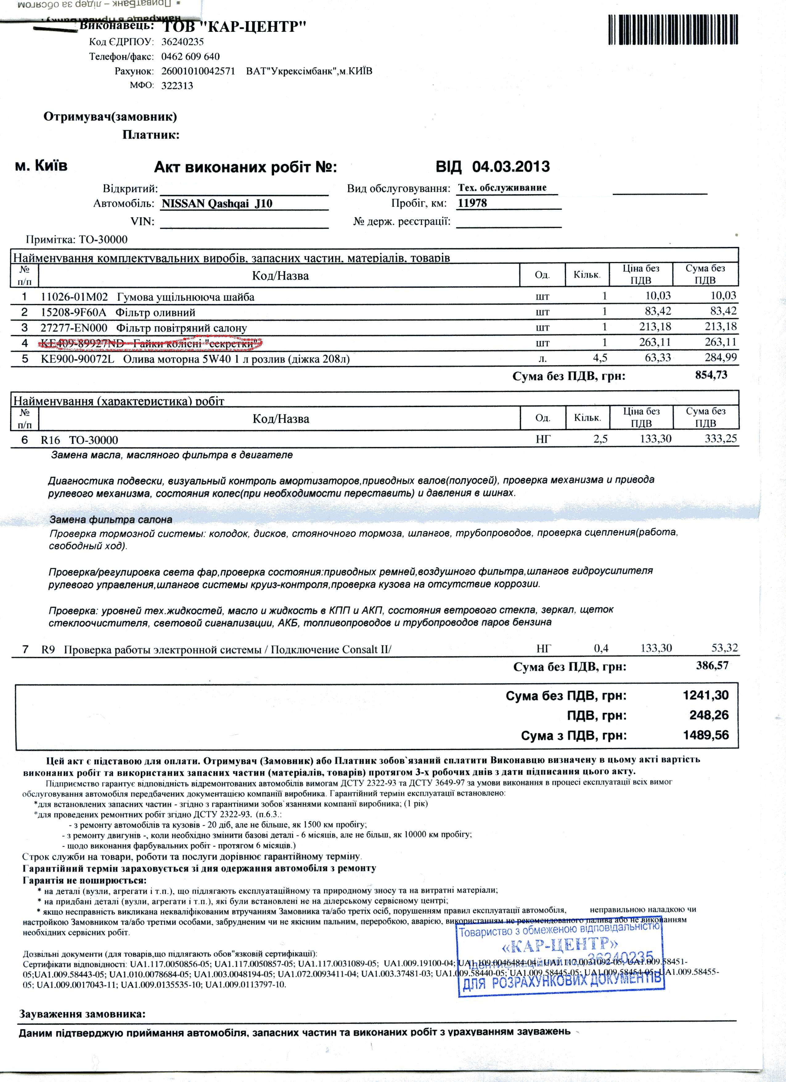 Вот копия наряда на прохождение ТО-2 в КАР-ЦЕНТР Чернигов.