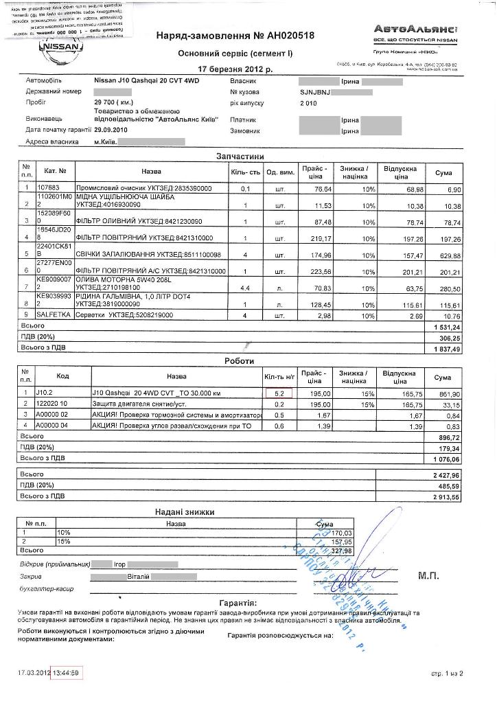 По итогу, всё встало мне в 2913,55 грн., счёт на гарантийные работы был около 1100 грн (хотя углы пошли паровозом к наконечнику по гарантии, 1 грн. за проверку всё-таки слупили!