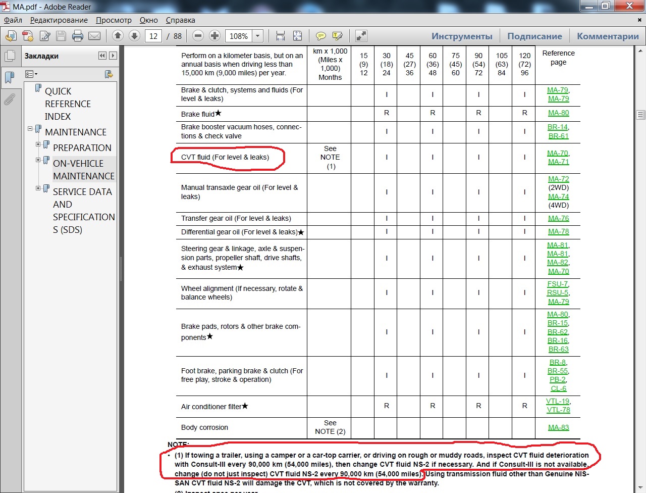 Вот ракопал в английском сервис-мануале, что масло в вариаторе они рекомендуют менять через 90 тыс. км. только если машина эксплуатируется в тяжелых условиях (тягает прицеп или кемпер, грунтовые дороги и т.п.).
