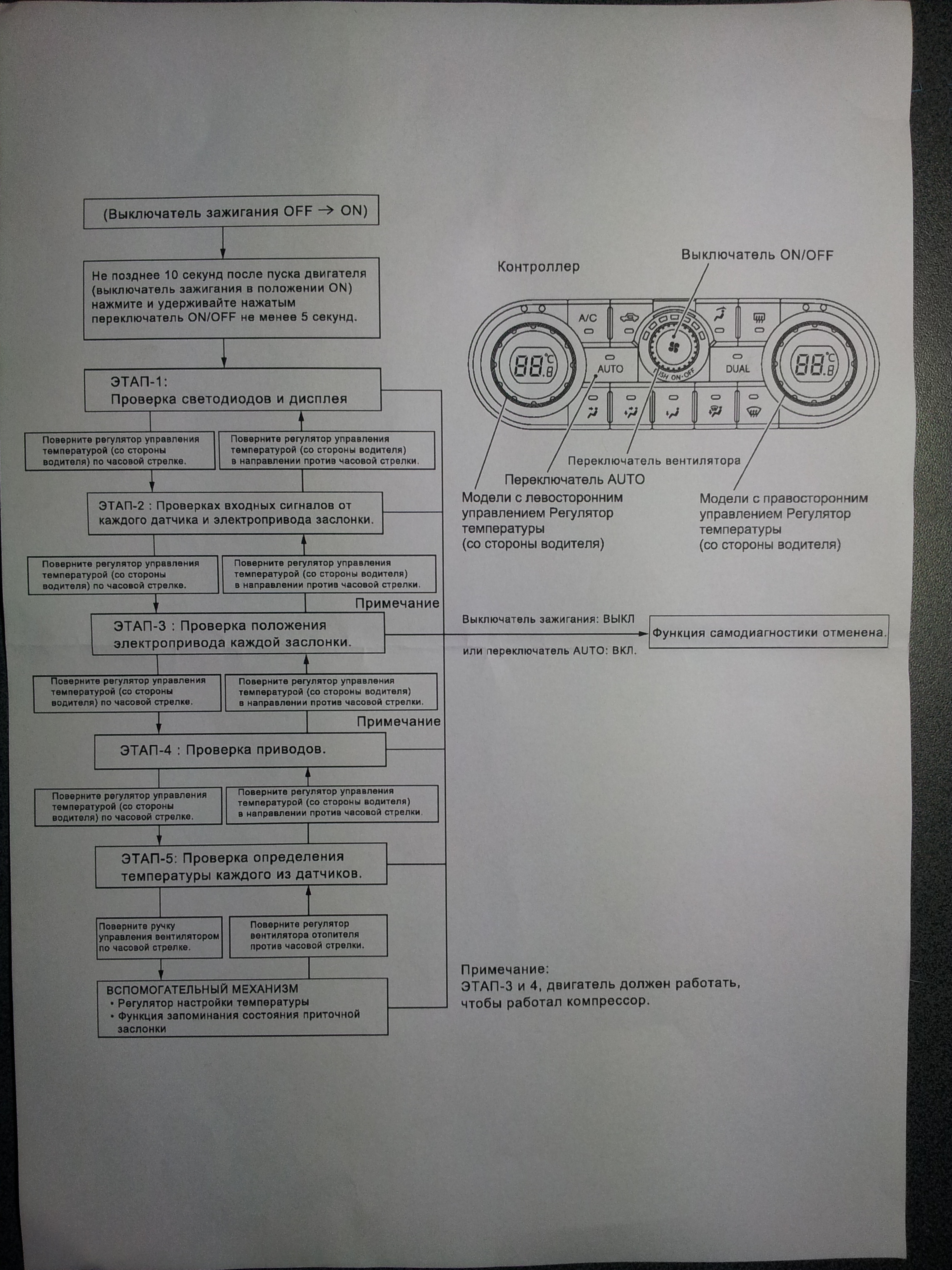У меня проблема та же, что и у VTS. На улице +27, включаю климат (+22), а он гонит горячий воздух (реально горячий). Воздух забортной температуры дует только если включить режим LO. Пару раз за день кондей включался и нормально охлаждал воздух, а потом после перезапуска опять горячий. Я думаю тут явно что-то с электроникой или с датчиками, но на СТО несмотря на все мои возмущения и жалобы они тупо спустили фреон и залили новый, взяли 400 гривен (замена + диагностика). Сказали, что в гарантию это не входит. Естественно на следующий день я опять езжу с открытыми окнами, на СТО назначили ехать через 2 дня. Может кто ещё с таким сталкивался, что можно проверить своими силами? Ещё бы схемы найти. А может у кого граната есть