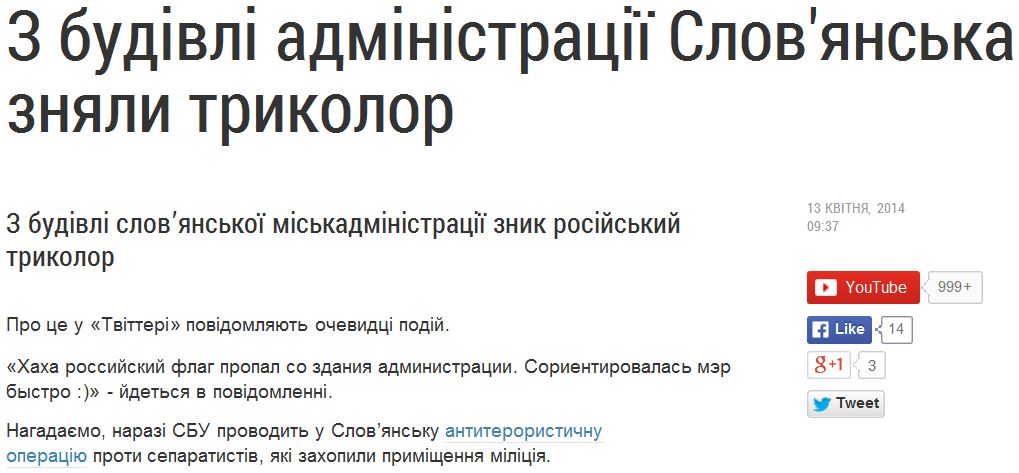 1. Началась АТО в Славянске. Руководит АТЦ СБУ Украины. Привлечены силы из всех силовых подразделений страны. С Богом!
