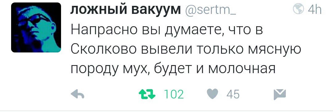 "Главное — делать настоящий продукт, который нужен людям, за который они готовы платить деньги, — отметил Шувалов. — За год Сколково очень преобразилось — и по стройке, и по тому, как здесь развиваются компании и что показывают компании. Совершенно другая атмосфера". И ведь некоторые идеи буквально летали вокруг. Достаточно было поймать. Как особую разновидность мух — мясную и высококалорийную. Мух разводят в лаборатории, скрещивают. Высушенные личинки — незаменимая белковая пища для птиц и домашних животных. А инноваторы уже думают о перспективах. "В дальнейшем это составит рацион питания людей", — говорят они.