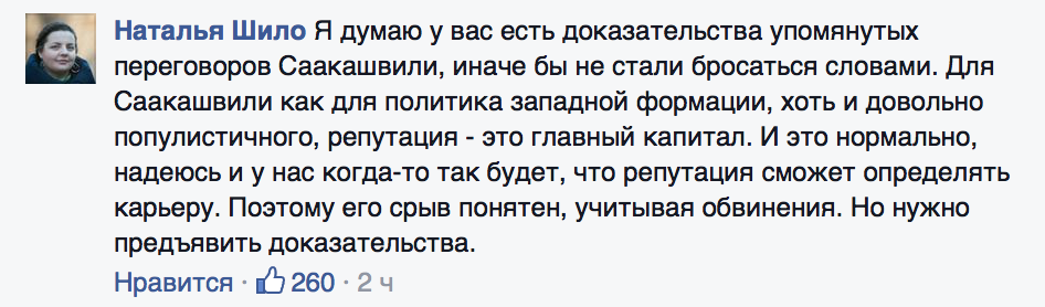 Вы мне это написали? Мне?, создавшему в МВД добробаты, куда смогли прийти патриоты с Майдана – сдержавшие агрессию в первые дни войны, когда армия отказывалась воевать!? Мне, которого Саакашвили обвинил за это – назвав этих ребят Незаконными бандформированиями, которые я содержу за свои коррупционные доходы?!! Да, я в начале войны принес 210 т. $ семейных сбережений и раздал ребятам из первого и второго резервного батальона Нацгвардии, вернувшимися тогда на несколько дней после меня из под Карачуна и Славянска – оборванными и без средств – ведь тогда мы только начинали.. Знаю и вы помогали и давали на фронт деньги, когда и президентом еще не были.. Знаю, но это вы пропустили мимо себя – не отреагировали в своем комментарии на этот выпад популиста против добробатов и меня.. Мне жаль, что это вам оказалось не так важно, как предложенная Вам политтехнологическая рамка..