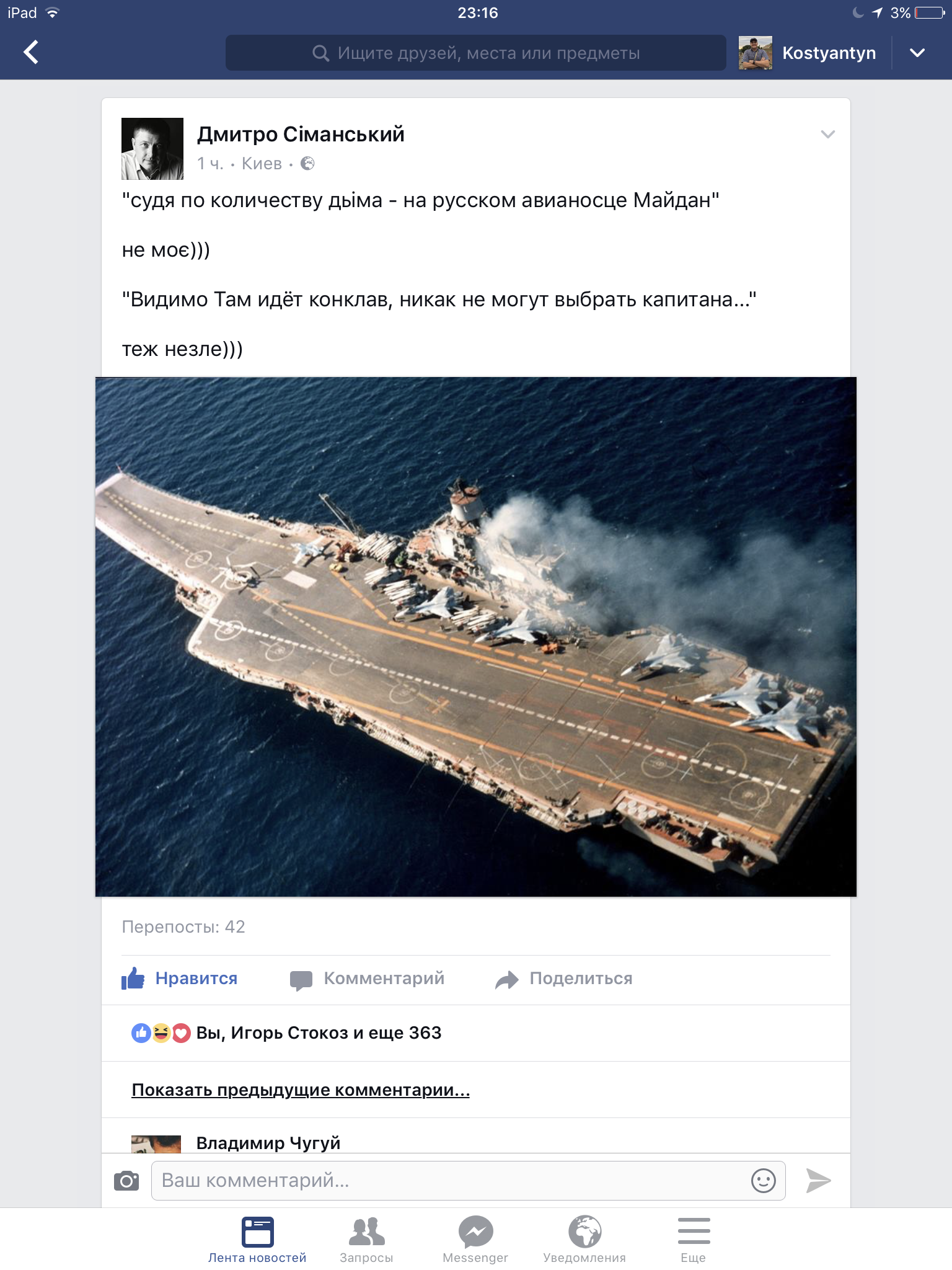 Кузнецов - авианосец с весьма ограниченными возможностями. Он - не ударный. Самолеты, базирующиеся на нем, не могут наносить серьезные удары по наземным целям. На авианосце наверняка нет значительных запасов авиабомб, т.к. без катапульты при таких размерах палубы с бомбовой нагрузкой не взлететь. Самолеты скорее всего заточены под функции ПВО и противокорабельные средства. Ведь был же в свое время сделан корабельный вариант штурмовика Су-25, но сейчас про них ничего не слышно. Наверное потому, что с потребной ударной нагрузкой они взлетать не могут, а без нее от Су-25 нет толку.